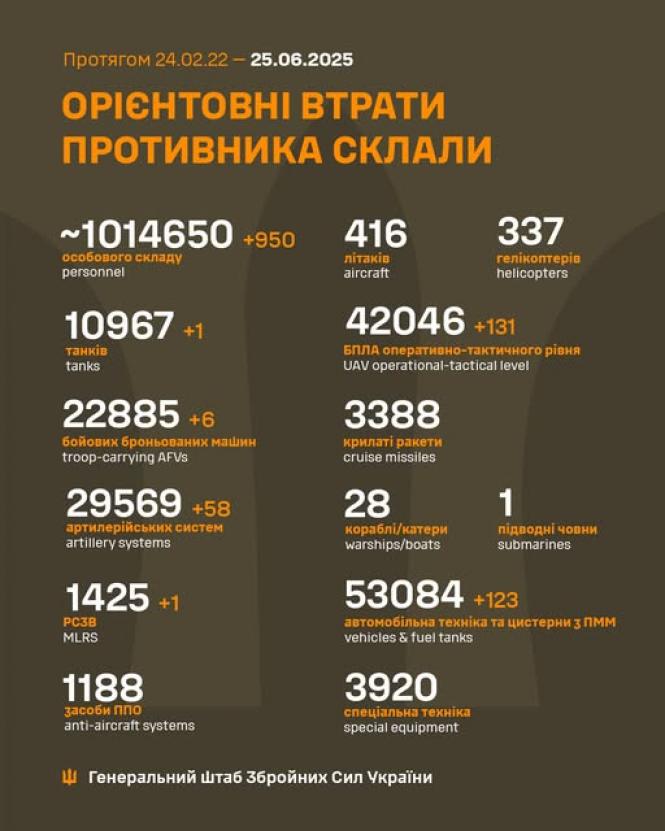 За уточненими даними Генштабу ЗСУ, противник протягом доби, 24 червня, здійснив три ракетні та 64 авіаційні удари, застосувавши дев'ять ракет і скинувши 118 керованих авіабомб. Крім того, окупанти здійснили 6338 обстрілів, з них 106 — із реактивних систем залпового вогню, та задіяли 3943 дрони-камікадзе. Авіаудари були нанесені по населених пунктах у Чернігівській, Харківській, Донецькій, Запорізькій та Херсонській областях.