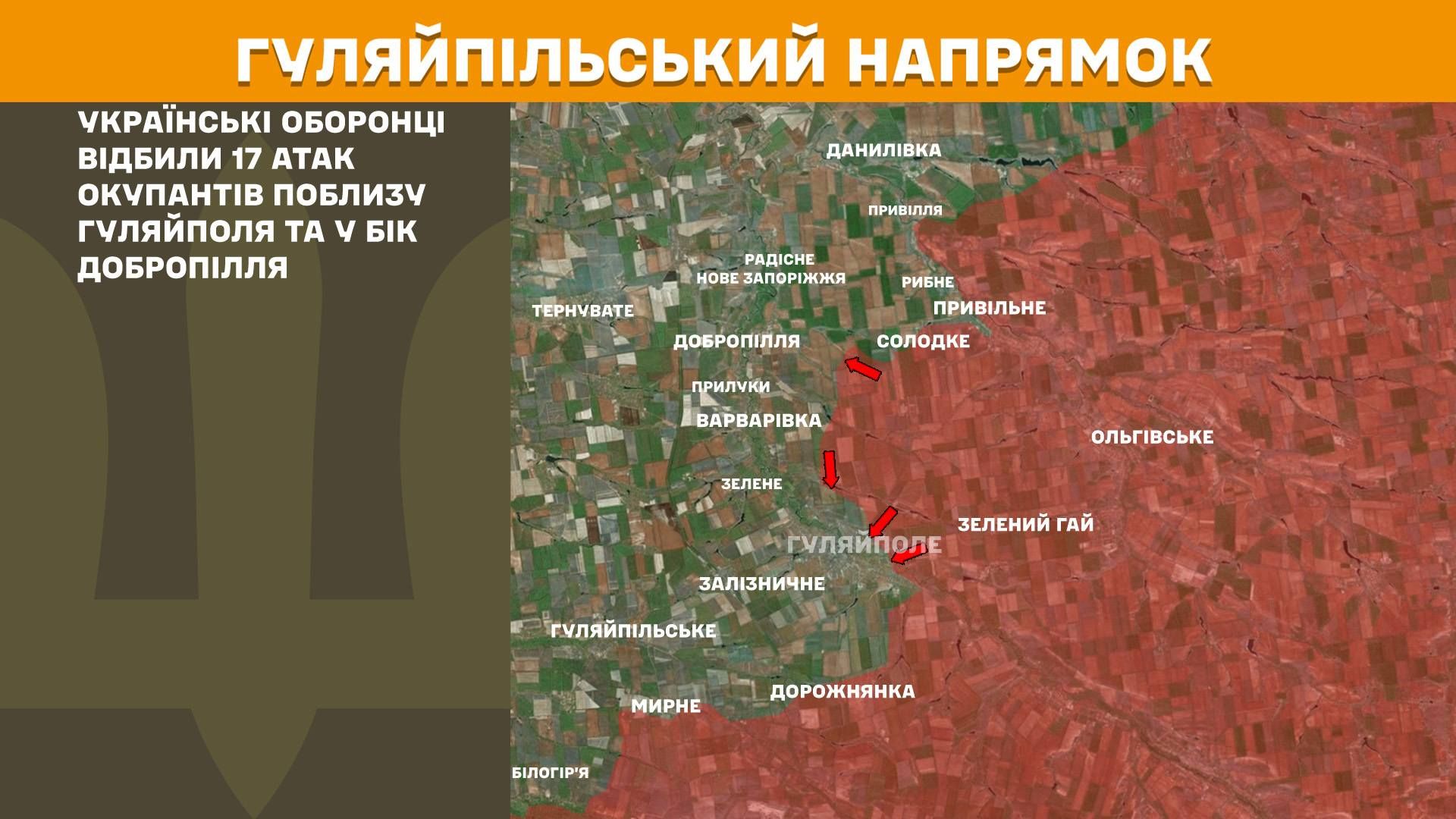 - Гуляйпільський напрямок: Воїни відбили 17 атак окупантів біюля Гуляйполя та Добропілля.