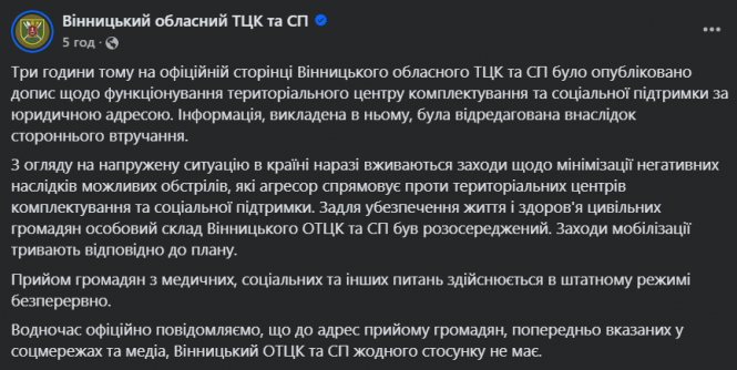 Вінницький обласний територіальний центр комплектування та соціальної підтримки (ТЦК та СП) спростовує інформацію про зміну адрес прийому громадян, яка раніше з'явилася у соцмережах та деяких медіа. Представники ТЦК заявили, що допис на їхній офіційній сторінці був відредагований внаслідок стороннього втручання.