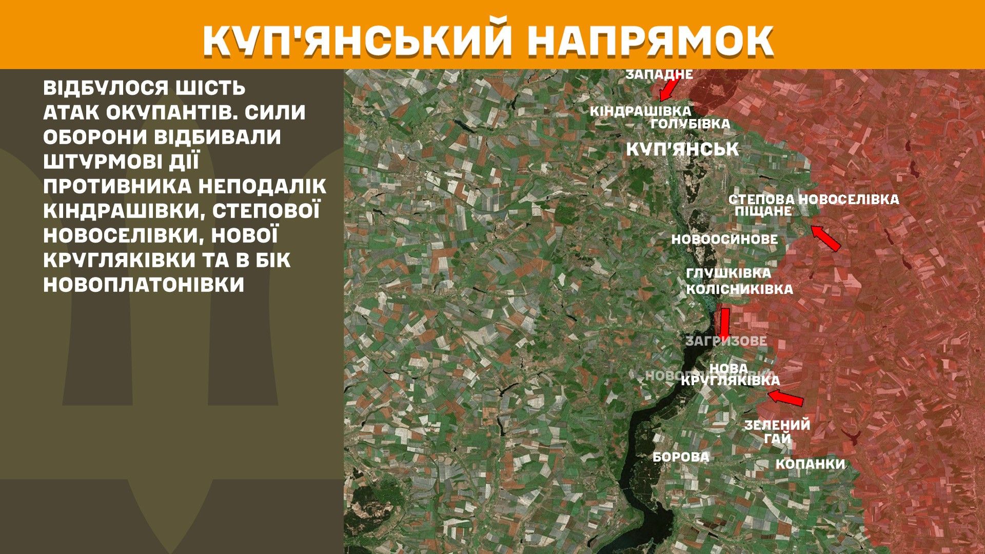- Куп'янський напрямок: Шість атак окупантів відбили Сили оборони біля Кіндрашівки, Степової Новоселівки, Нової Кругляківки та в бік Новоплатонівки.