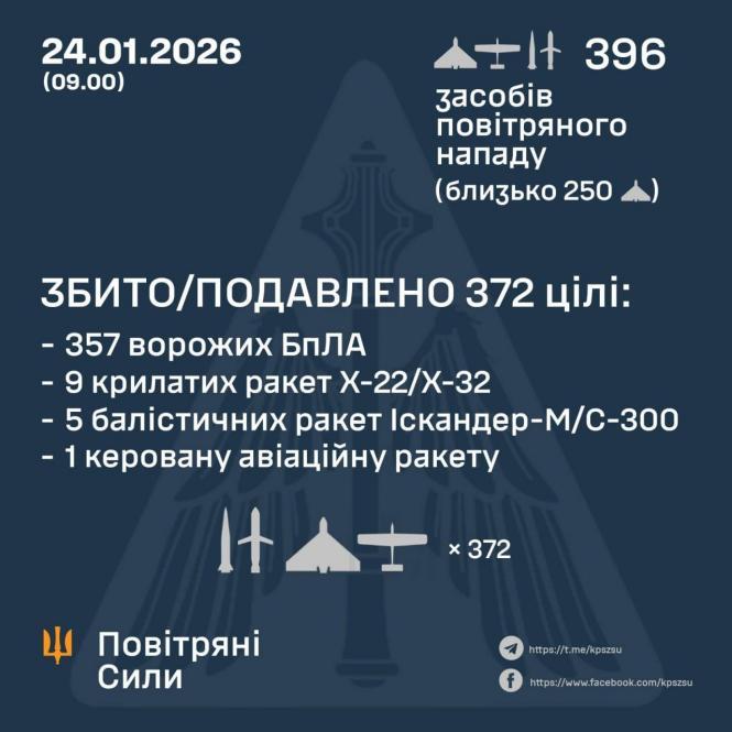 Радіотехнічні війська виявили у небі 396 цілей. Завдяки спільній роботі авіації, зенітників та мобільних вогневих груп вдалося знищити 372 об'єкти: