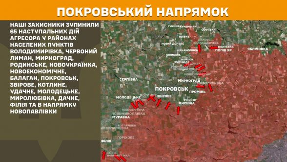 - Покровський напрямок: Наші захисники зупинили 65 наступальних дій агресора. Бої точилися в районах Володимирівки, Червоного Лиману, Мирнограда, Покровська та ще низки населених пунктів.