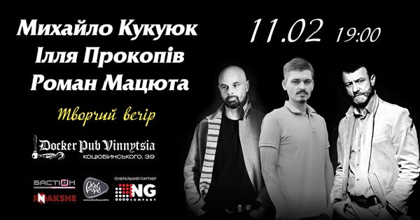 11 лютого в Docker Pub нечувана подія — творчий вечір за участі трьох талановитих акторів та музикантів, неймовірних чоловіків — Михайла Кукуюка, Роман Мацюти та Іллі Прокопіва.