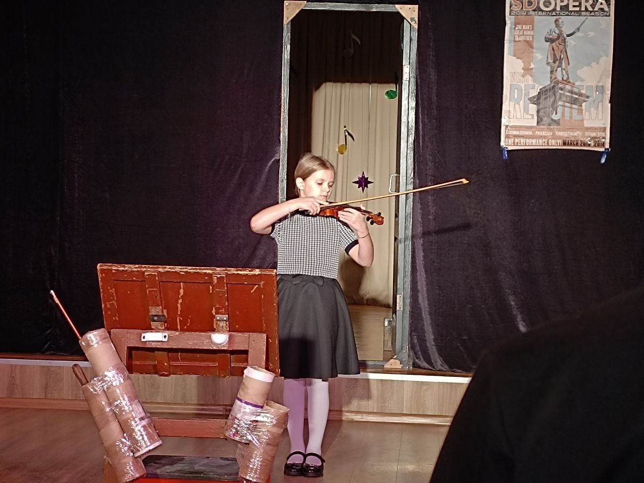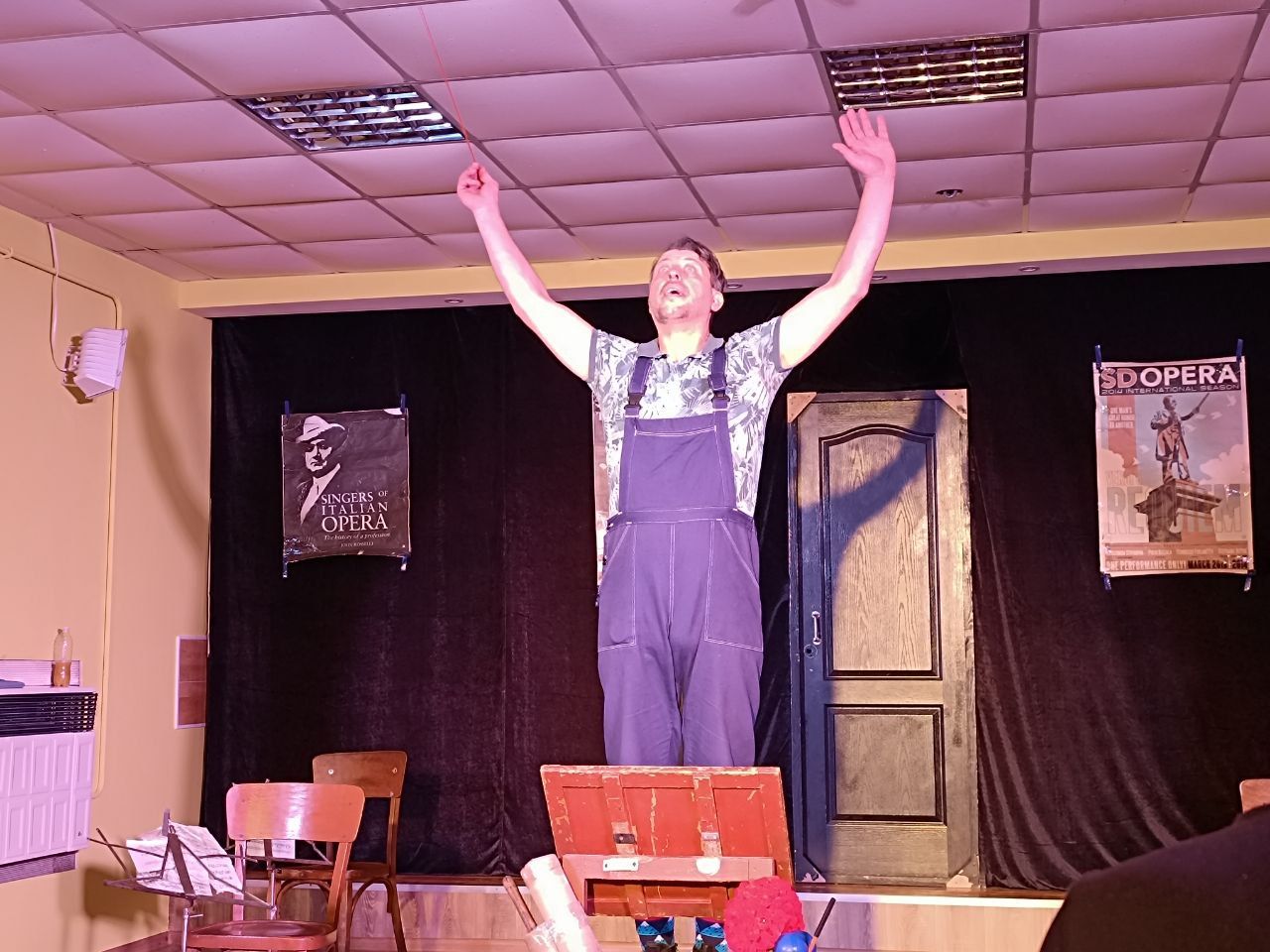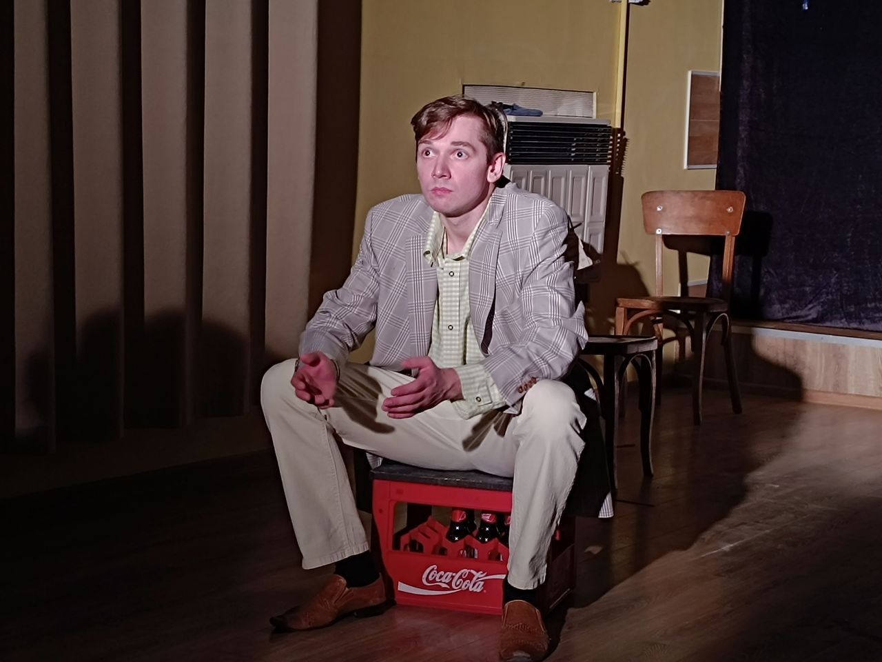 Але повернімось до історії самої вистави. У нас є головний герой Тіко, якого грає Сергій Киржа. Він намагається зібрати власний оркестр, «який допоможе йому втілити мрію всього свого життя». Навколо героя стоять декілька стільців, на яких має грати оркестр, «поношені» ноти і старенький пюпітр.