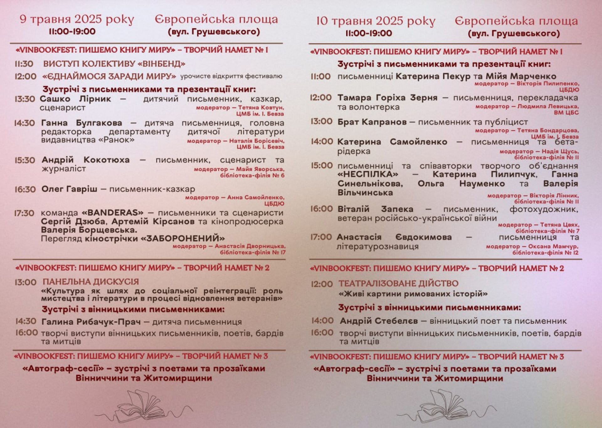 - «Творчий намет» «VinBookFest: пишемо книгу Миру», який стане майданчиком для зустрічей з письменниками, авторських читань та автограф-сесій.