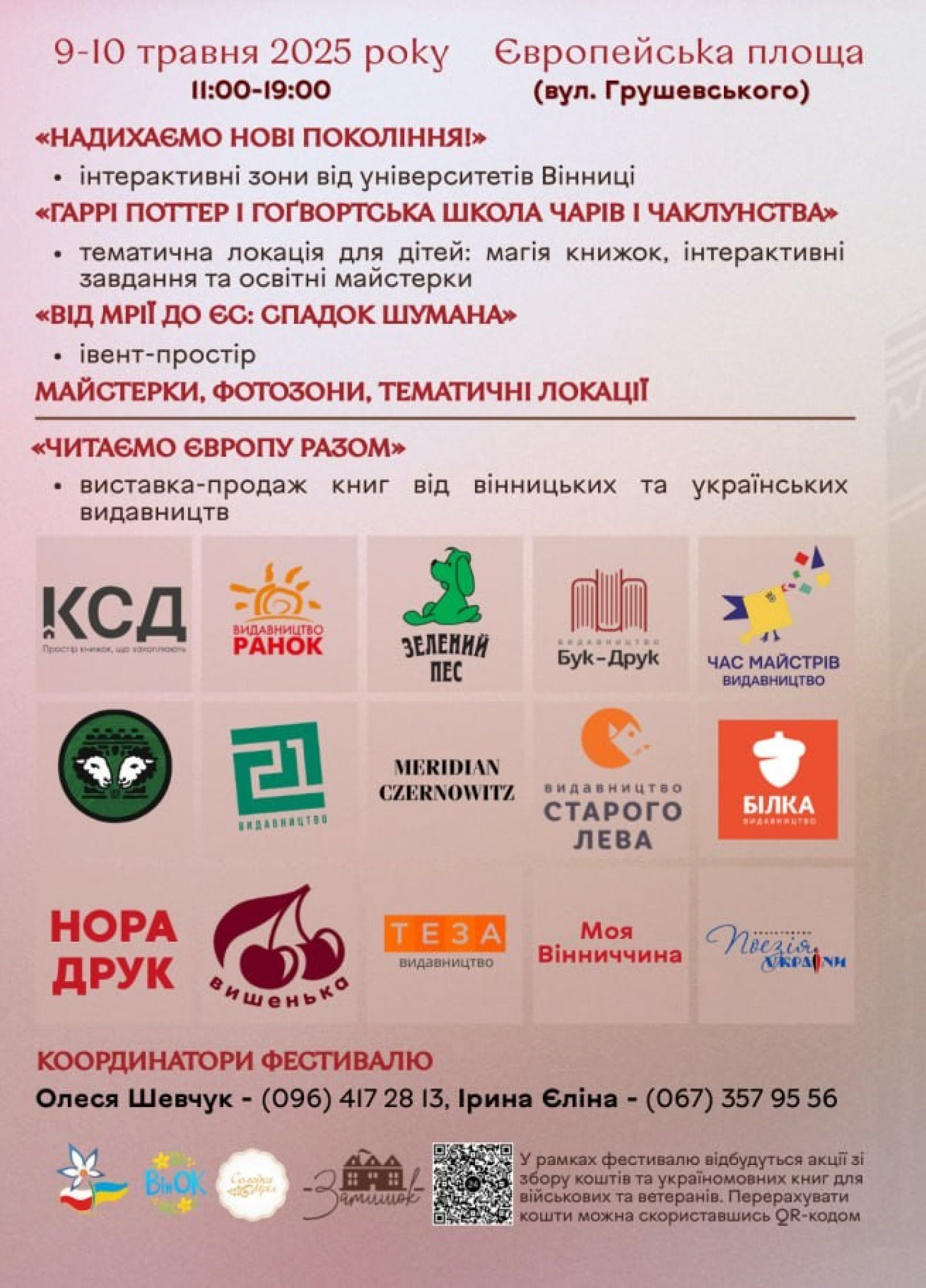 - Виставку-продаж «Читаємо Європу разом», де будуть представлені книги від вінницьких та інших українських видавництв.