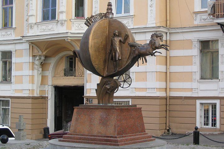 Посеред апельсину вставлена фігура російського імператора Павла I. Скульптурна композиція включає трійку коней, запряжених у апельсин. На апельсині розташовані найвідоміші будівлі Одеси: Оперний театр, Спасо - Преображенський собор, колонада Воронцовського палацу.