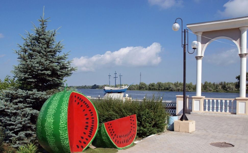 Місцеві жителі Голої пристані в 2008 році увічнили свій улюблений баштан в скульптурі на набережній. Великий кавун, виготовлений з бетону, в розрізі доповнює арт-скульптурні композиції набережної. Пам’ятник відкрили під час шостого фестивалю Українського кавуна. Його висота, як і ширина становить 175 см. Розташований пам’ятник кавуну близько оглядової альтанки. На сонці ця незвичайна скульптура виглядає особливо яскраво.