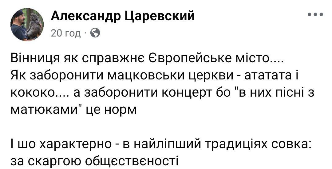 «Вінниця — як справжнє європейське місто… Як заборонити мацковські церкви — «ататата» і «кококо»… А заборонити концерт, бо «в них пісні з матюками», — це норм. І шо характерно — в найліпших традиціях совка: за скаргою «общєствєнності».