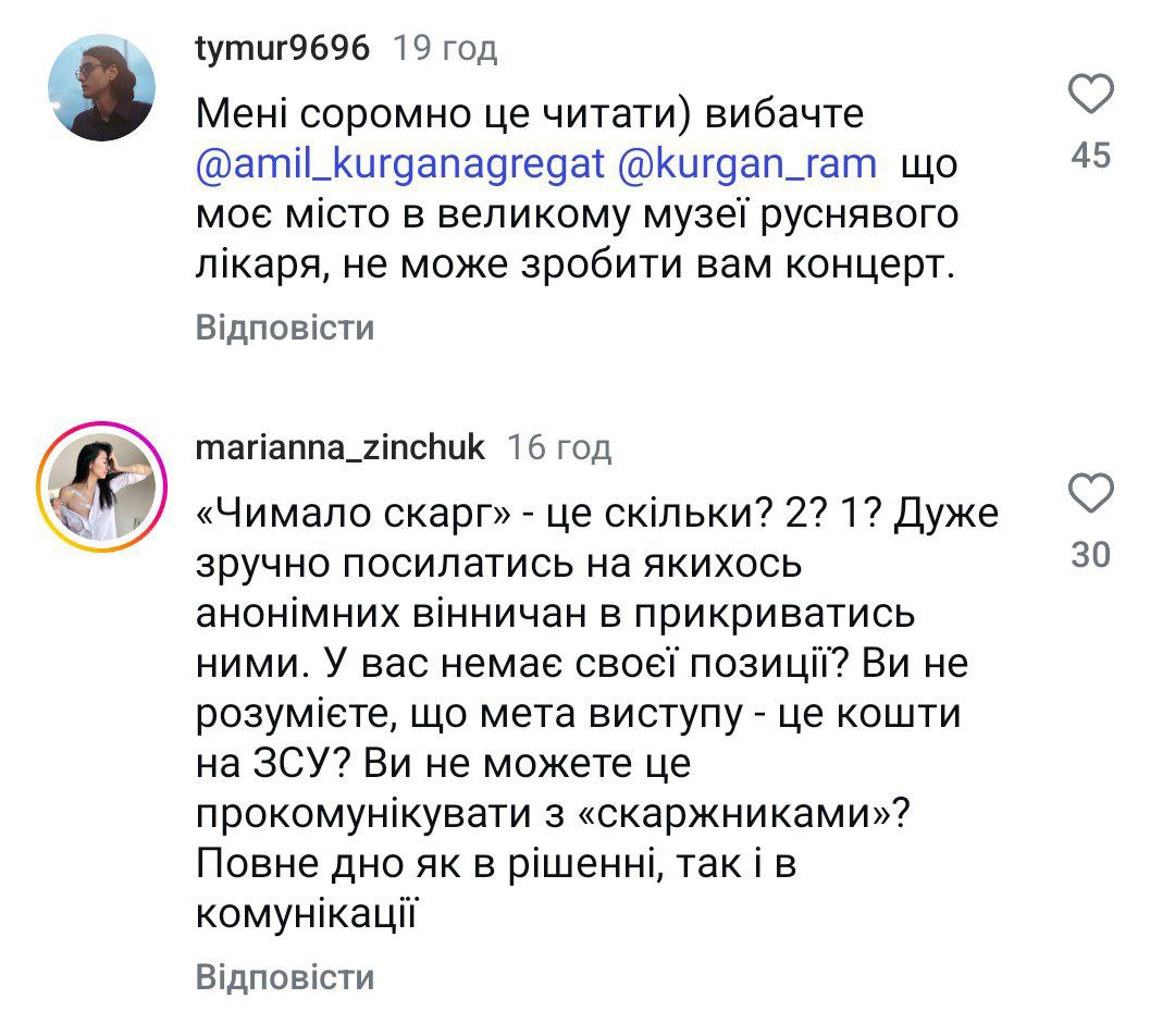 «Чимало скарг» — це скільки? Дві? Одна? Дуже зручно посилатися на якихось анонімних вінничан і прикриватися ними. У вас немає своєї позиції? Ви не розумієте, що мета виступу — це кошти на ЗСУ? Ви не можете це прокомунікувати зі «скаржниками»? Повне дно — як у рішенні, так і в комунікації».