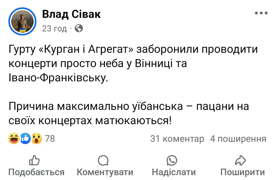 «Гурту «Курган & Agregat» заборонили проводити концерти просто неба у Вінниці та Івано-Франківську. Причина максимально (дурна — авт.) — пацани на своїх концертах матюкаються!»