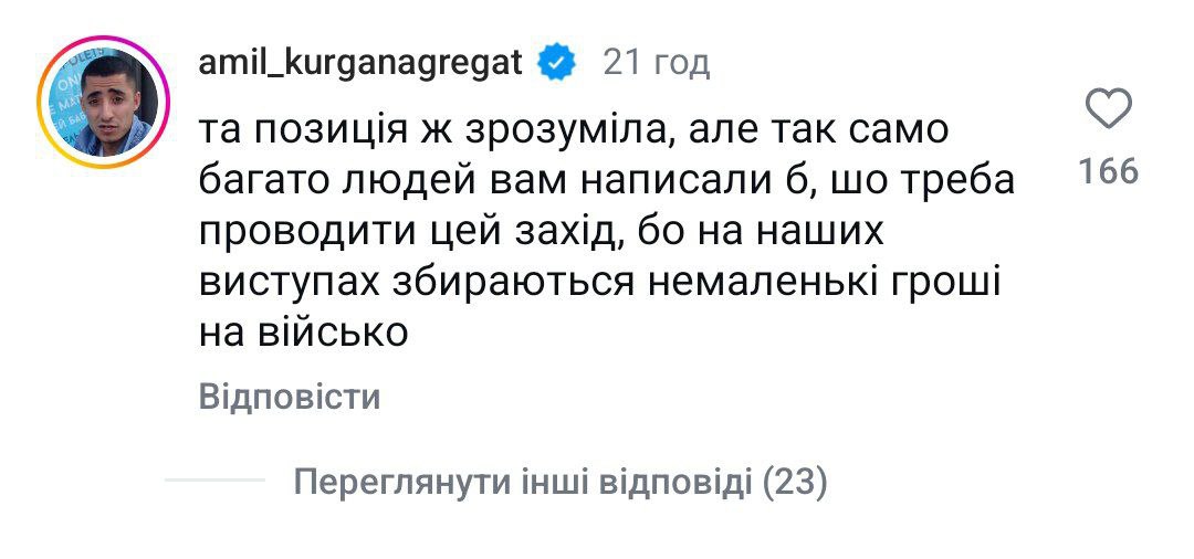 «Та позиція ж зрозуміла. Але так само багато людей написали б вам, що захід треба проводити, бо на наших виступах збираються немаленькі гроші на військо».