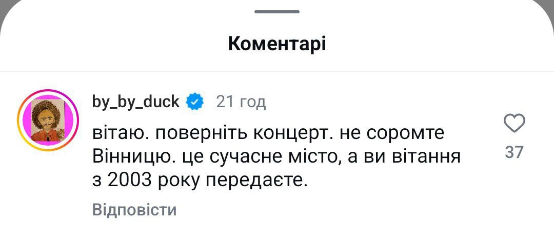 «Вітаю. Поверніть концерт. Не соромте Вінницю. Це сучасне місто, а ви вітання з 2003 року передаєте», — написав він у коментарях.