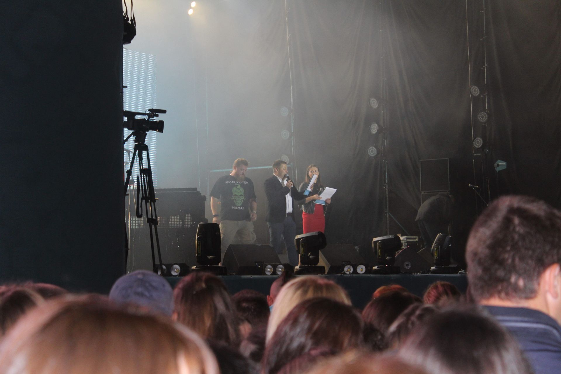 Здивували й порадували своєю появою ведучі – учасники команди КВК «V.I.P Тернопіль» Тетяна Песик і Віктор Гевко. Протягом усієї програми вони підігрівали натовп не лише жартами, а й фізично: змушуючи стрибати, підіймати руки, аплодувати, робити селфі й надсилати SMS-повідомлення на спеціальний номер, який містив число 655 – саме стільки років виповнилося Вінниці. Взявши участь в останній ініціативі – смішно привітавши місто – найоригінальніший відправник отримав поповнення мобільного рахунку на 655 грн.. Ведучі вирішили зачитати кілька повідомлень, і в одному з них «не мєстна» просила у Вінниці гроші на квиток додому, який коштує саме стільки гривень.
