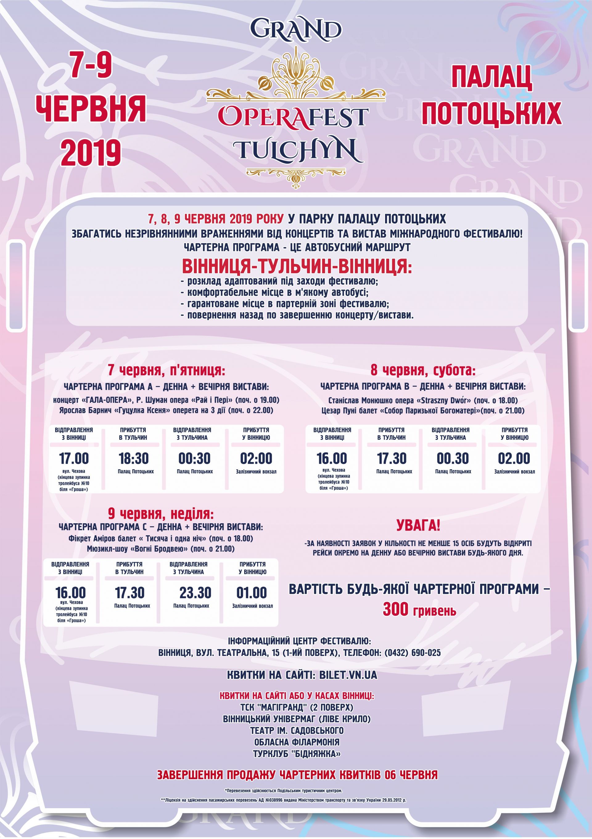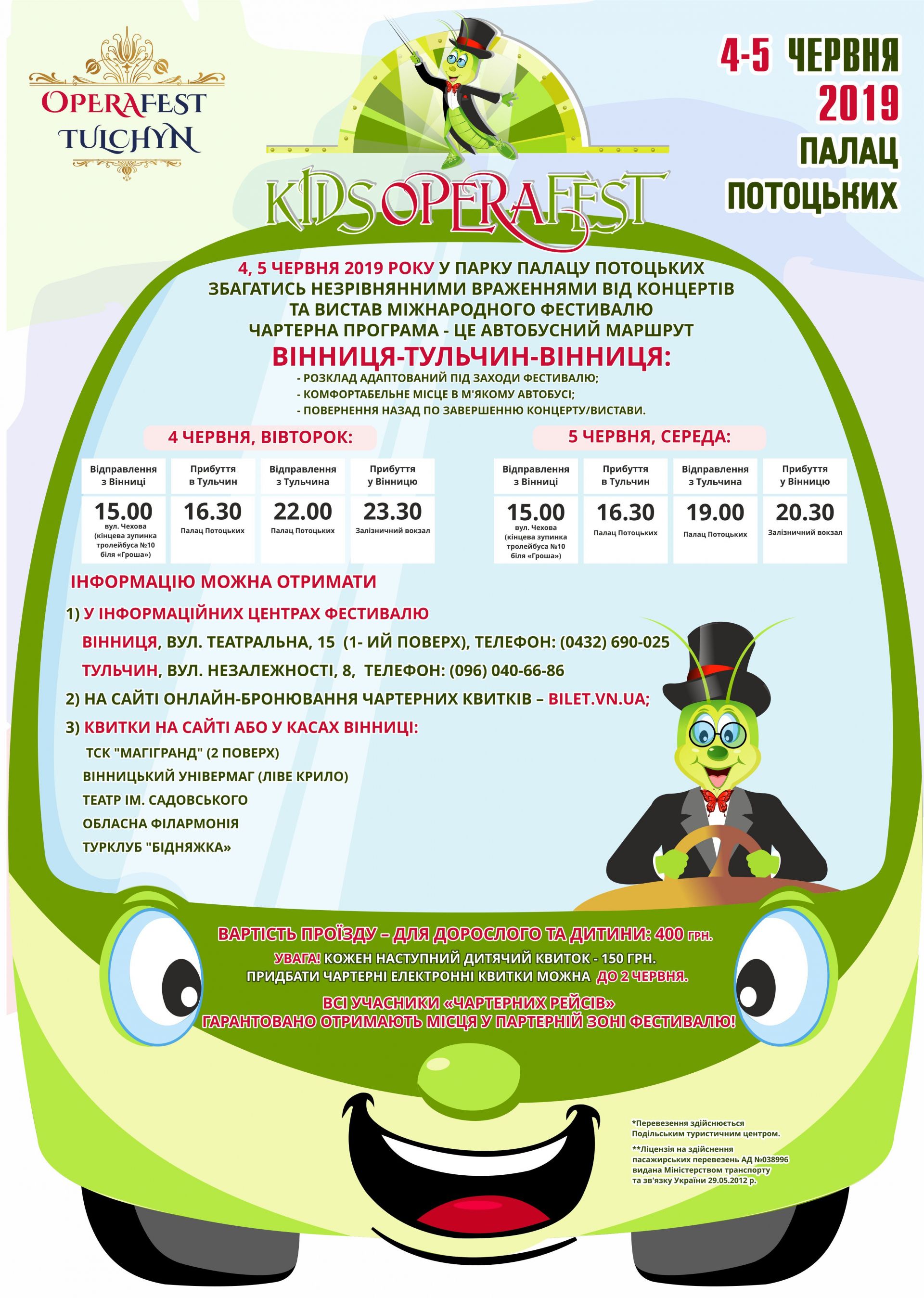 Для кращої зручності організатори влаштували чартерні перевезення у всі дні фестивалю з Вінниці у Тульчин і відповідно – назад. Квитки на «чартери» можна буде придбати з 17 квітня у інформаційному центрі фестивалю (вул. Театральна, 15) і у касах міста: в театрі ім. Садовського, туристичному центрі «Подільський», туристичному клубі «Бідняжка», філармонії та «Магігранді«, а також у місті Тульчин за адерсою вул. Незалежності, 8.
