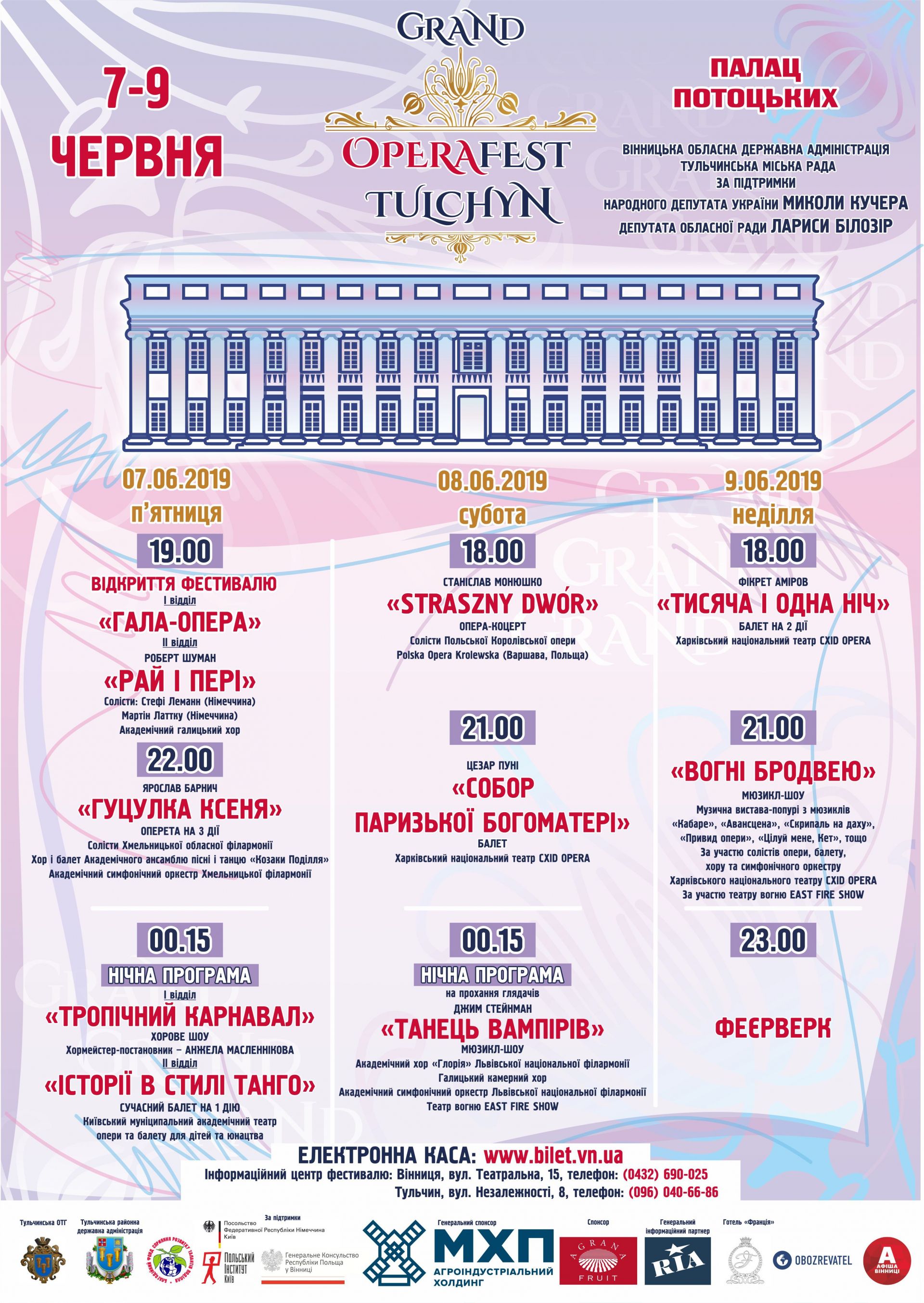 Міжнародний оперний фестиваль OPERAFEST TULCHYN цього року буде проходити з 4-го до 9-го червня. Протягом п’яти днів на території палацу Потоцьких лунатимуть твори відомих композиторів: Роберта Шумана, Карлоса Гаделя, Фікрета Амірова, Джима Стейнмана, Ярослава Барнича та інших.