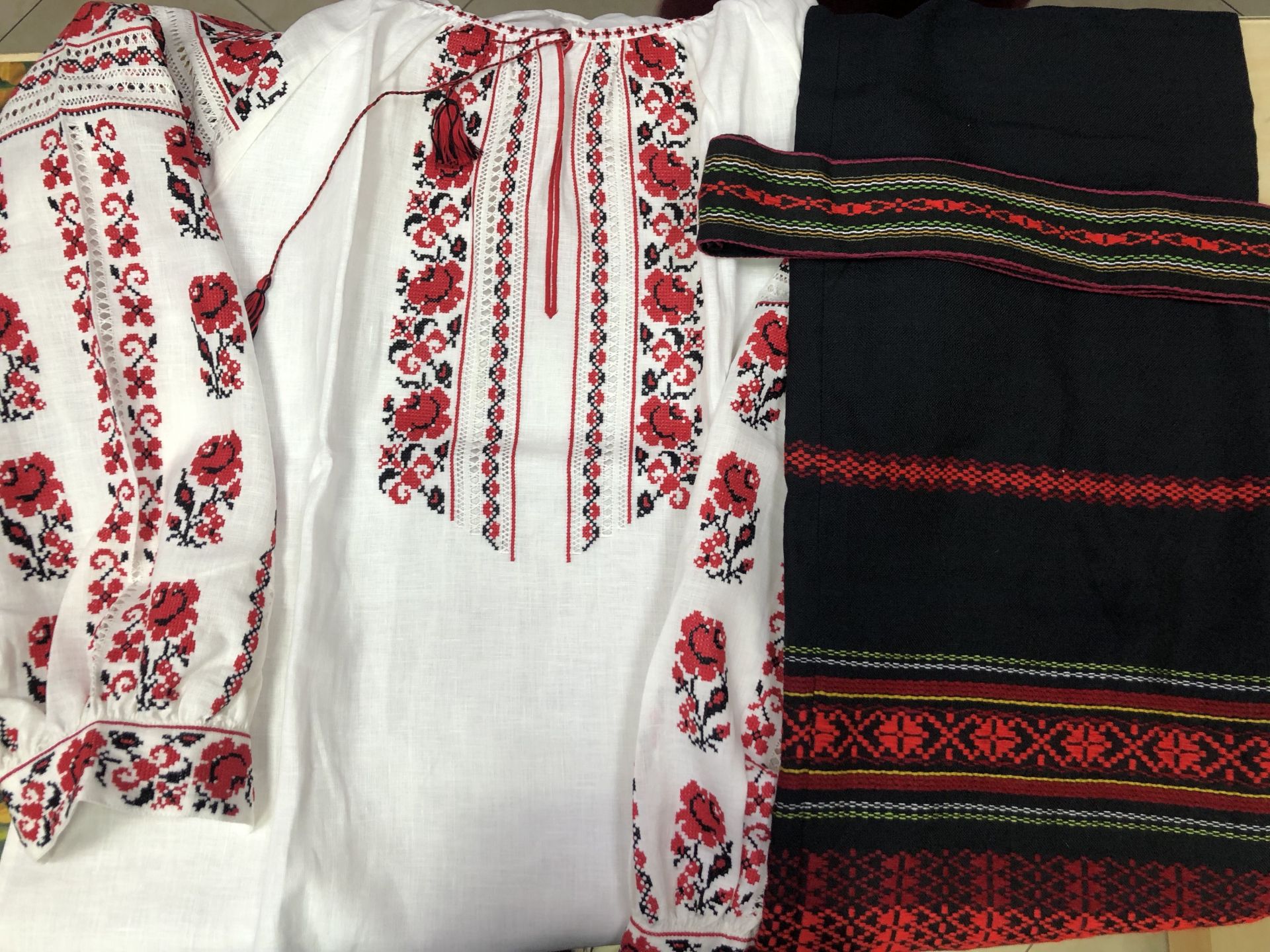Поки директор розповідала про орнамент та вишукану роботу майстра, на прилавку з'явилися плахта та кушак. Це довга вишита спідниця та пояс. Саме так потрібно носити вишиванку. Звичайно, такий образ неможливо не приміряти. Тому на журналістці 20minut.ua ви можете бачити вишиванку ручної роботи за вісім тисяч гривень, плахту за вісімсот гривень, пояс та намисто. Власне, на такий український образ доведеться «викласти» не менше десяти тисяч гривень. Виконаний він у ручну. Якщо подивитися на зворотню сторону вишиванки, то не знайдеться жодного вузла – це говорить про майстерну роботу. За словами пані Ніни, така сорочка виготовляється протягом трьох місяців.