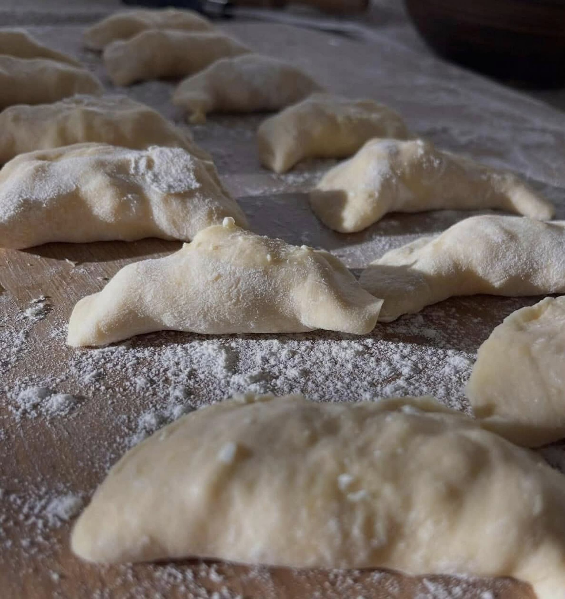 Тісто замішують на суміші молока (200 мл) та теплої води з додаванням яєць і олії. Це робить його надзвичайно ніжним. У начинку — домашній сир, цукор та яйце.