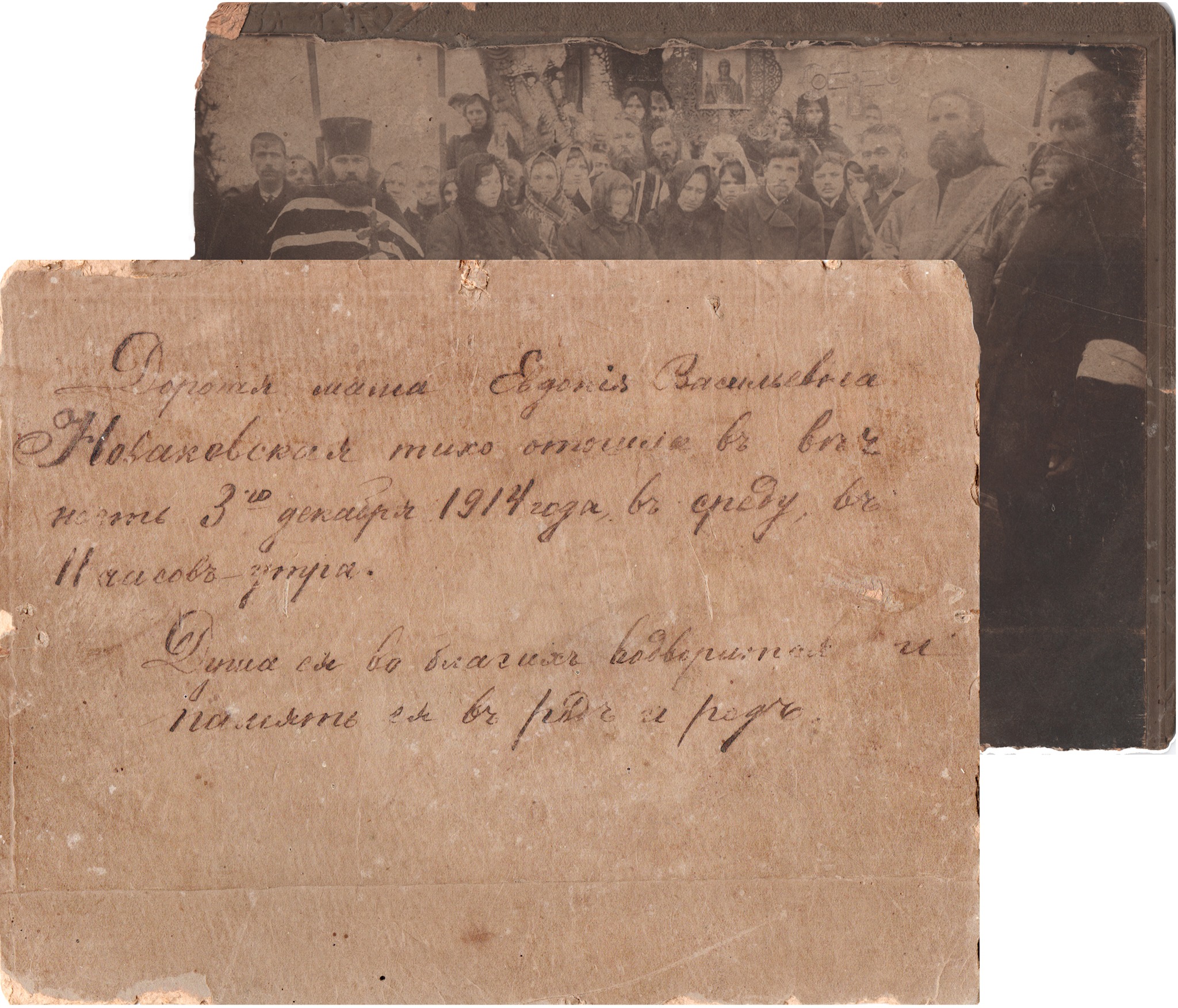 На звороті напис: «Дорога мама Євдокія Василівна Новаківська тихо відійшла у вічність 3-го грудня 1914 року, в середу, об 11 годині ранку. Душа її буде у блаженстві, і пам’ять про неї – з роду в рід».
