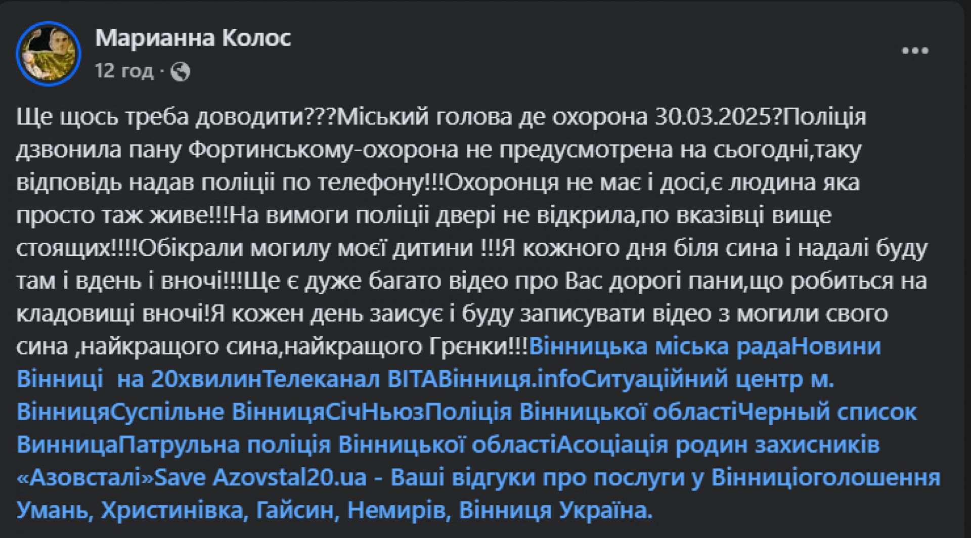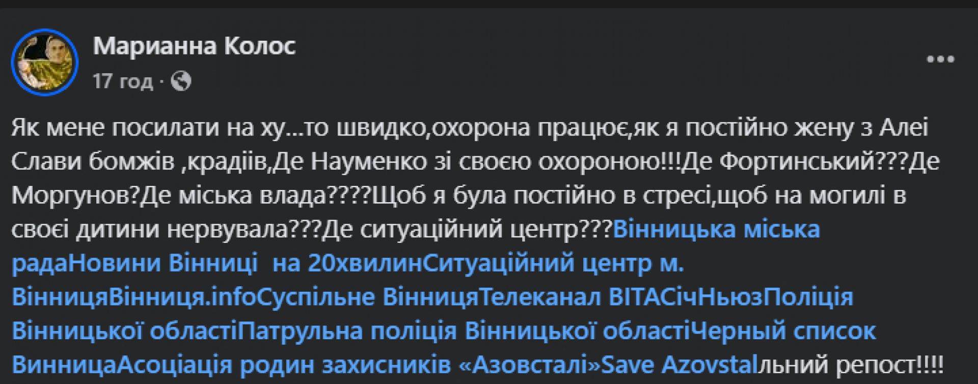 - «Як мене посилати на ху…то швидко, охорона працює, як я постійно жену з Алеї Слави бомжів, крадіїв. Де Науменко зі своєю охороною!!! Де Фортинський??? Де Моргунов? Де міська влада????Щоб я була постійно в стресі, щоб на могилі в своєї дитини нервувала??? Де ситуаційний центр???»
