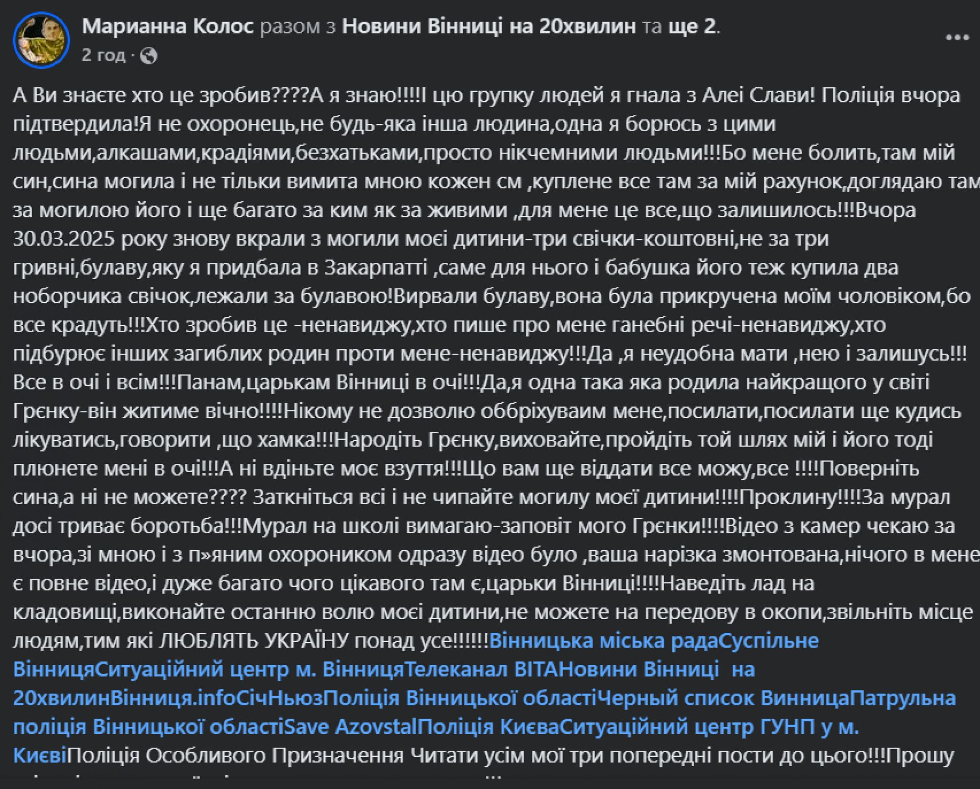 Жінка стверджує, що могилу її сина було пограбовано, а охорона на кладовищі фактично відсутня. Вона вимагає пояснень від міського голови та інших посадовців, а також негайних дій для забезпечення безпеки на Алеї Слави.