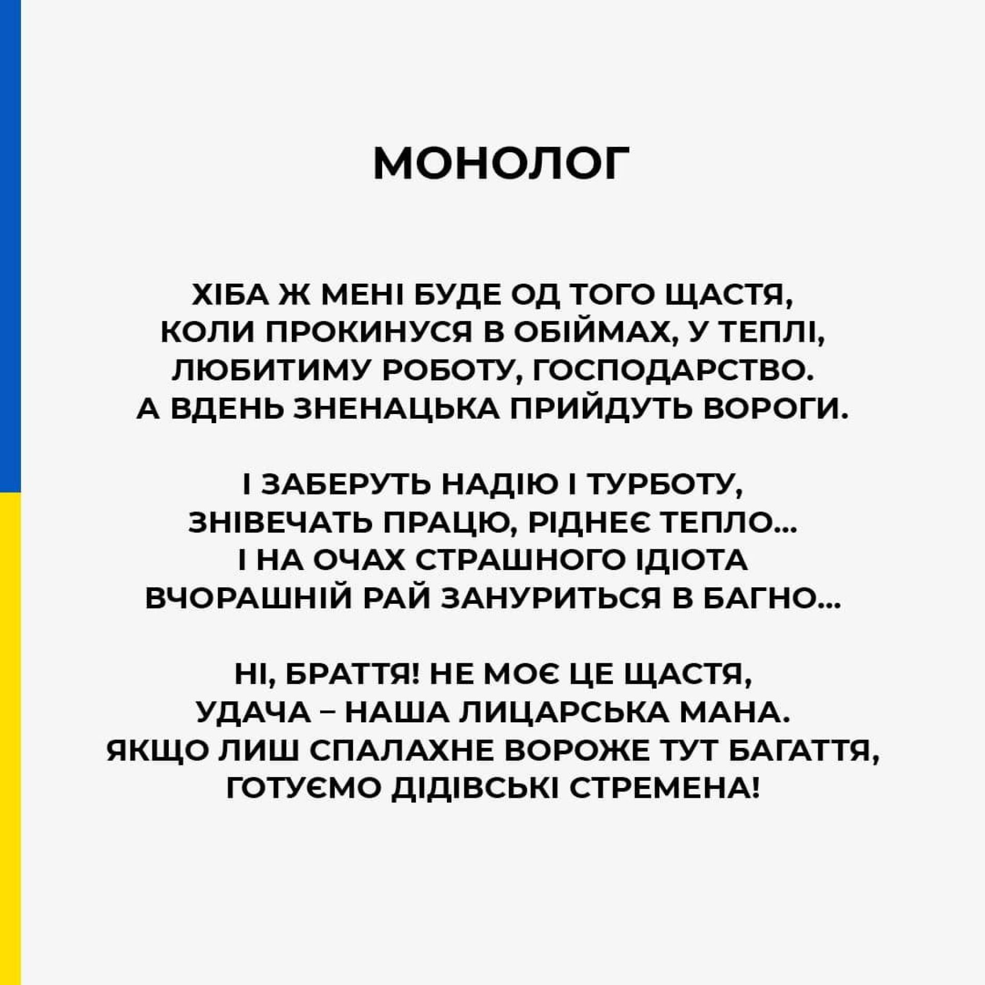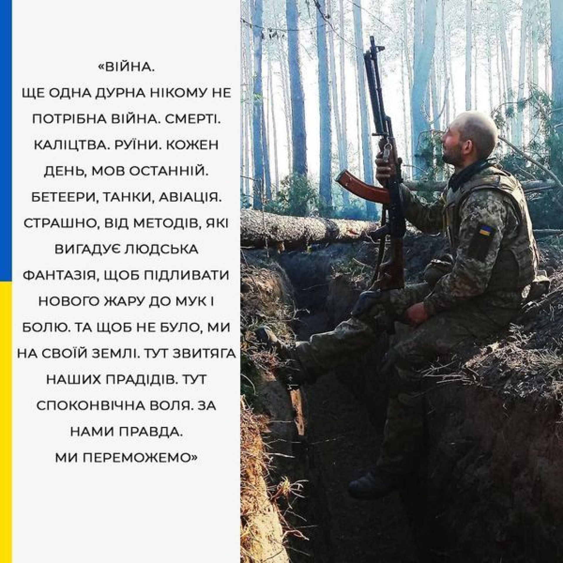 - «Війна. Ще одна дурна нікому не потрібна війна. Смерті. Каліцтва. Руїни. Кожен день, мов останній. Бетеери, танки, авіація. Страшно, від методів, які вигадує людська фантазія, щоб підливати нового жару до мук і болю. Та щоб не було, ми на своїй землі. Тут звитяга наших прадідів. Тут споконвічна воля. За нами правда. Ми переможемо».