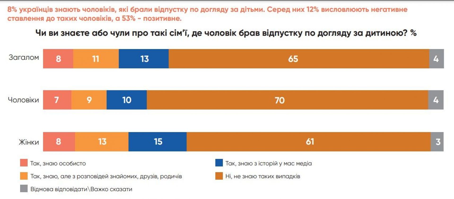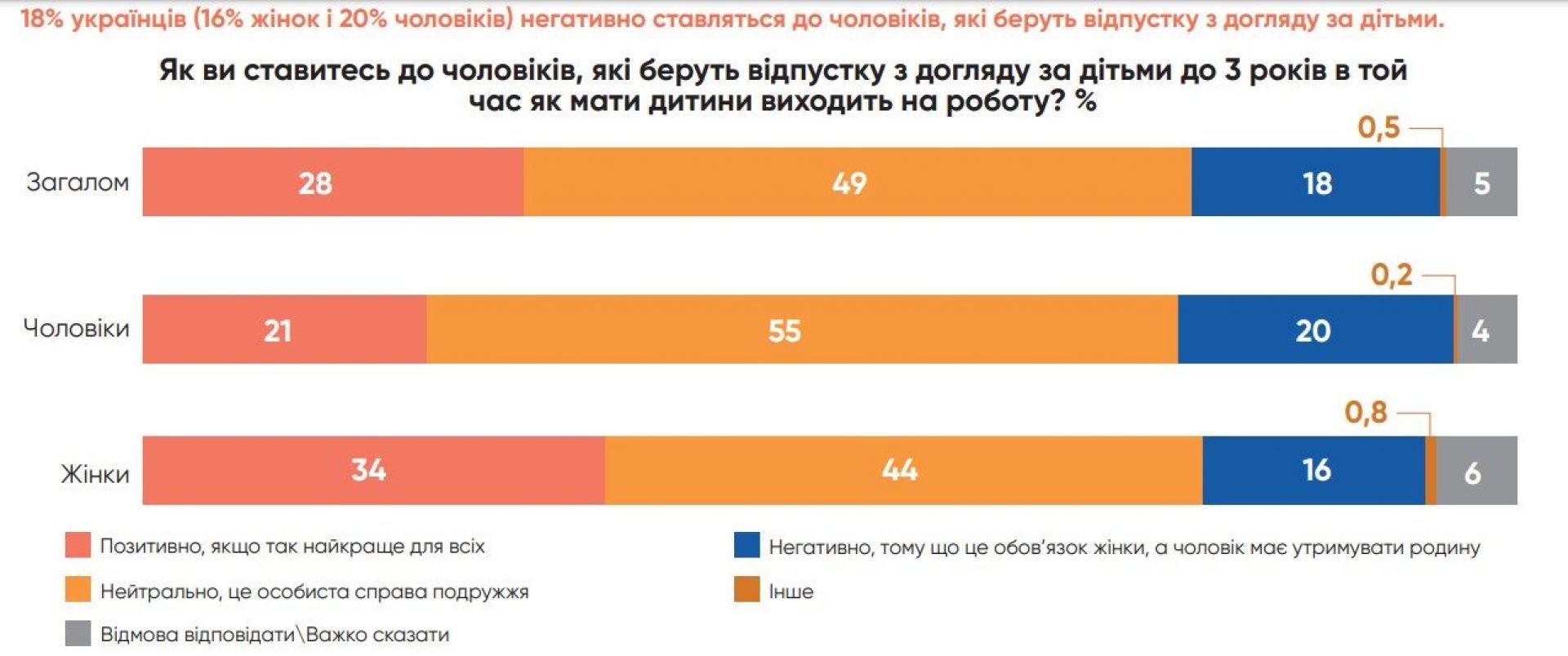 Як бачимо в результатах дослідження Фонду народонаселення ООН за 2020 рік, в Україні лише 2% чоловіків йдуть у декрет замість своїх дружин. Більшість матерів пояснюють недостатню увагу до дітей з боку батька високою зайнятістю. Проте є й 19% тих, хто вважає, що це «жіноча справа».