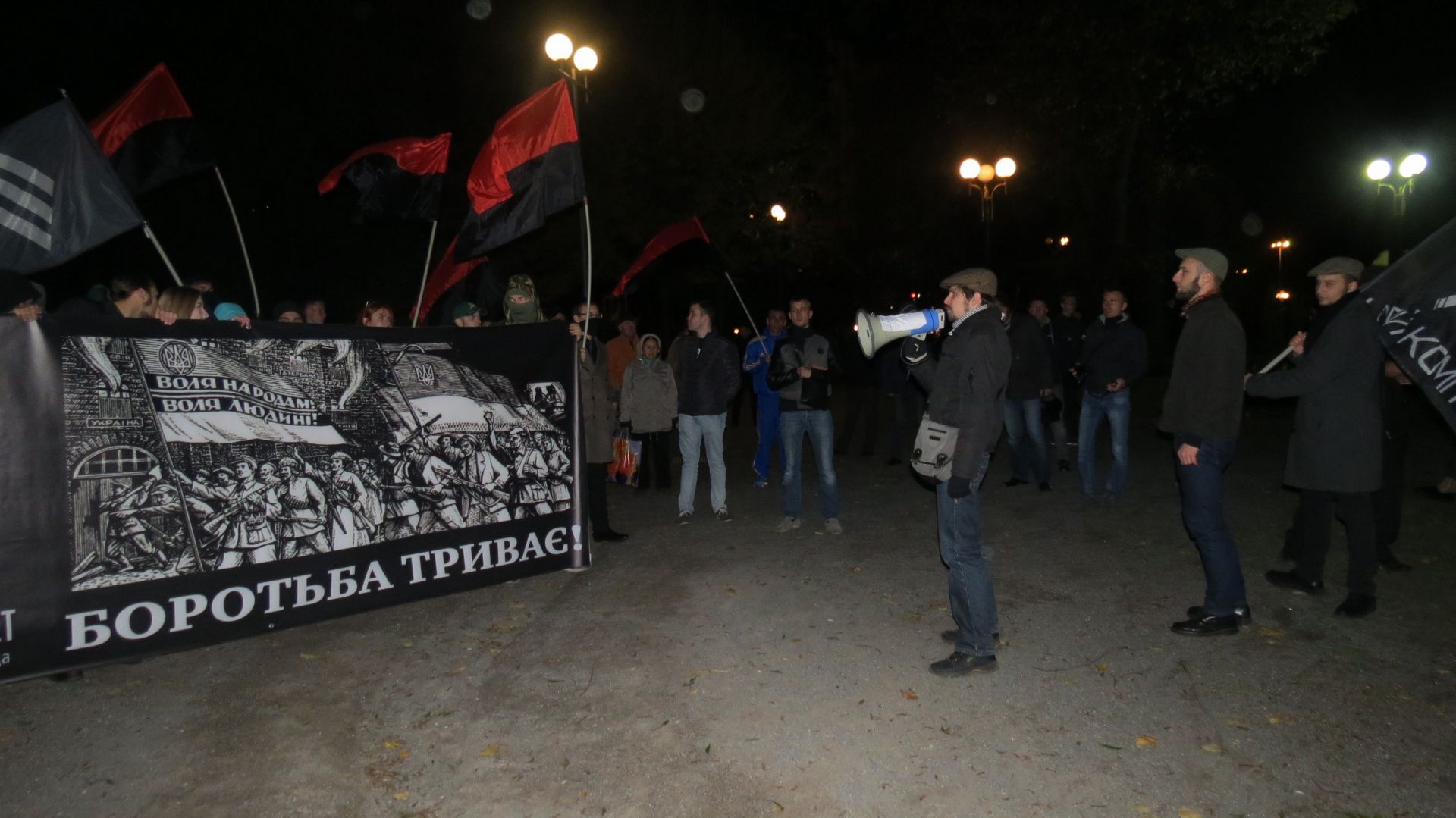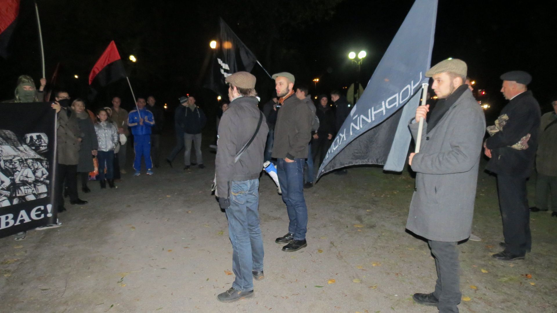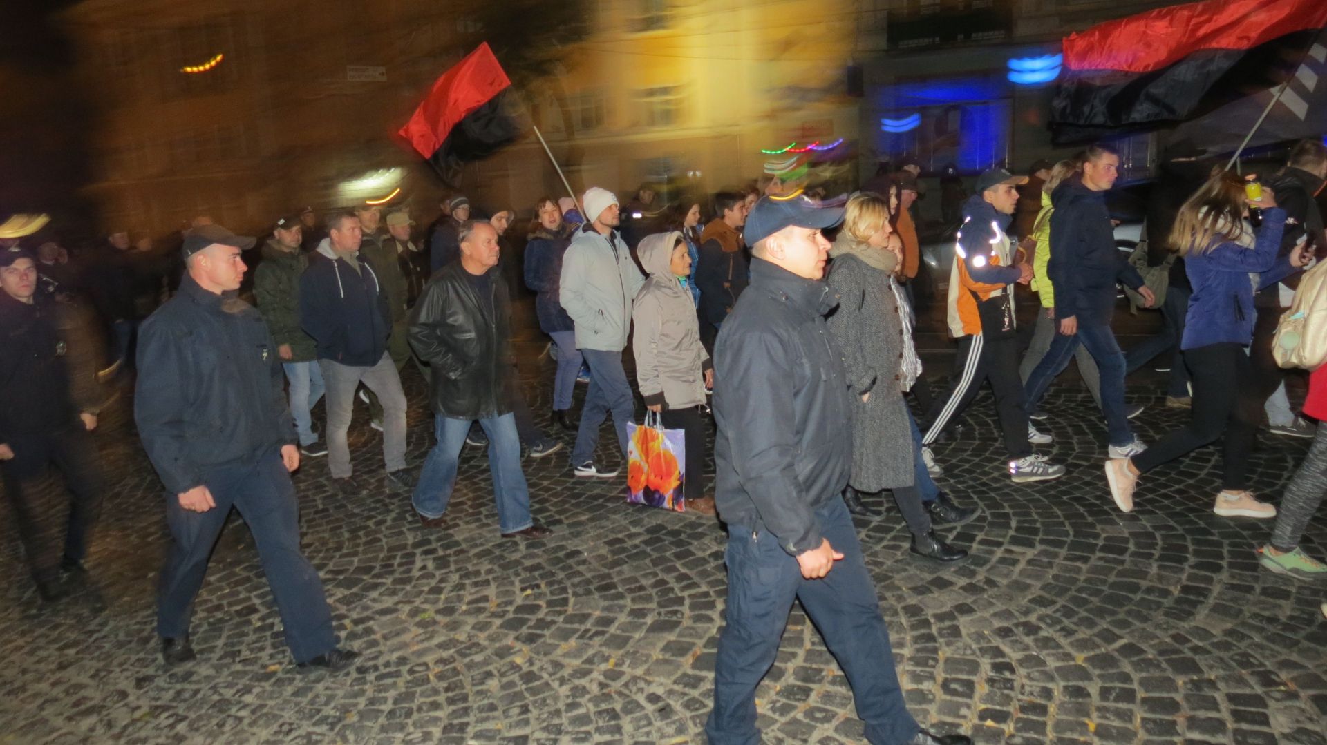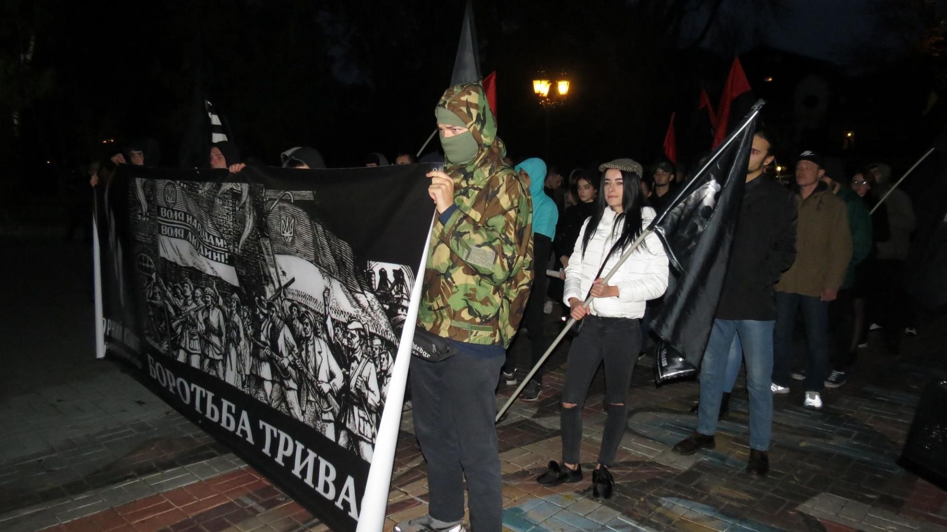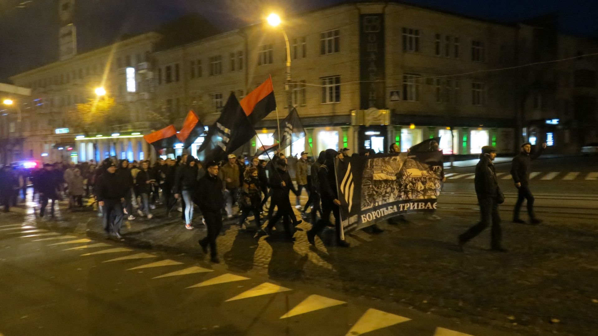 Вони зібралися на Європейській площі і пройшли колоною до пам’ятника Січовим стрільцям, що біля «Книжки». По дорозі запалювали фаєри і вигукували агресивні гасла. Серед них були: «Крим наш! Донбас наш! Кубань наша!», «Революція!», «Олігархи –– жирують! Герої – бідують!» тощо. Правоохоронці супроводжували молодих активістів, а деякі з них фотографували і записували їхні дії на відео.