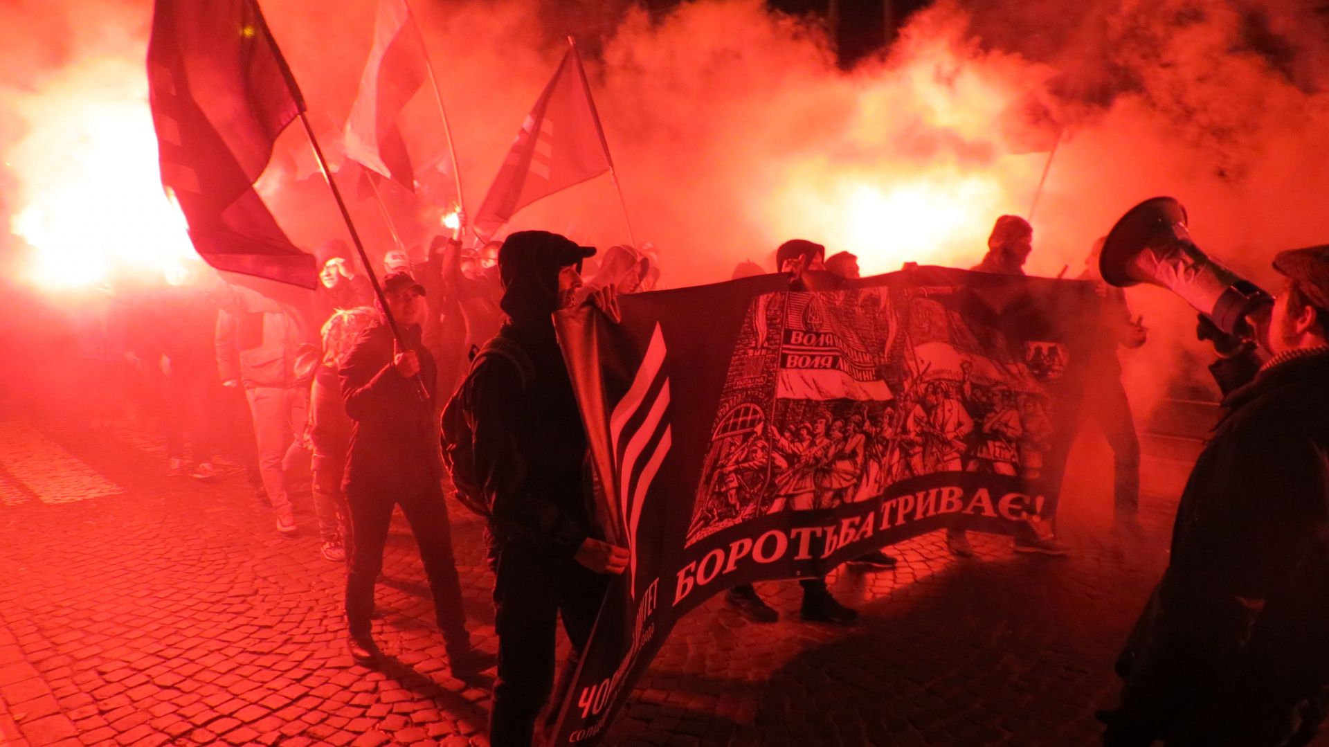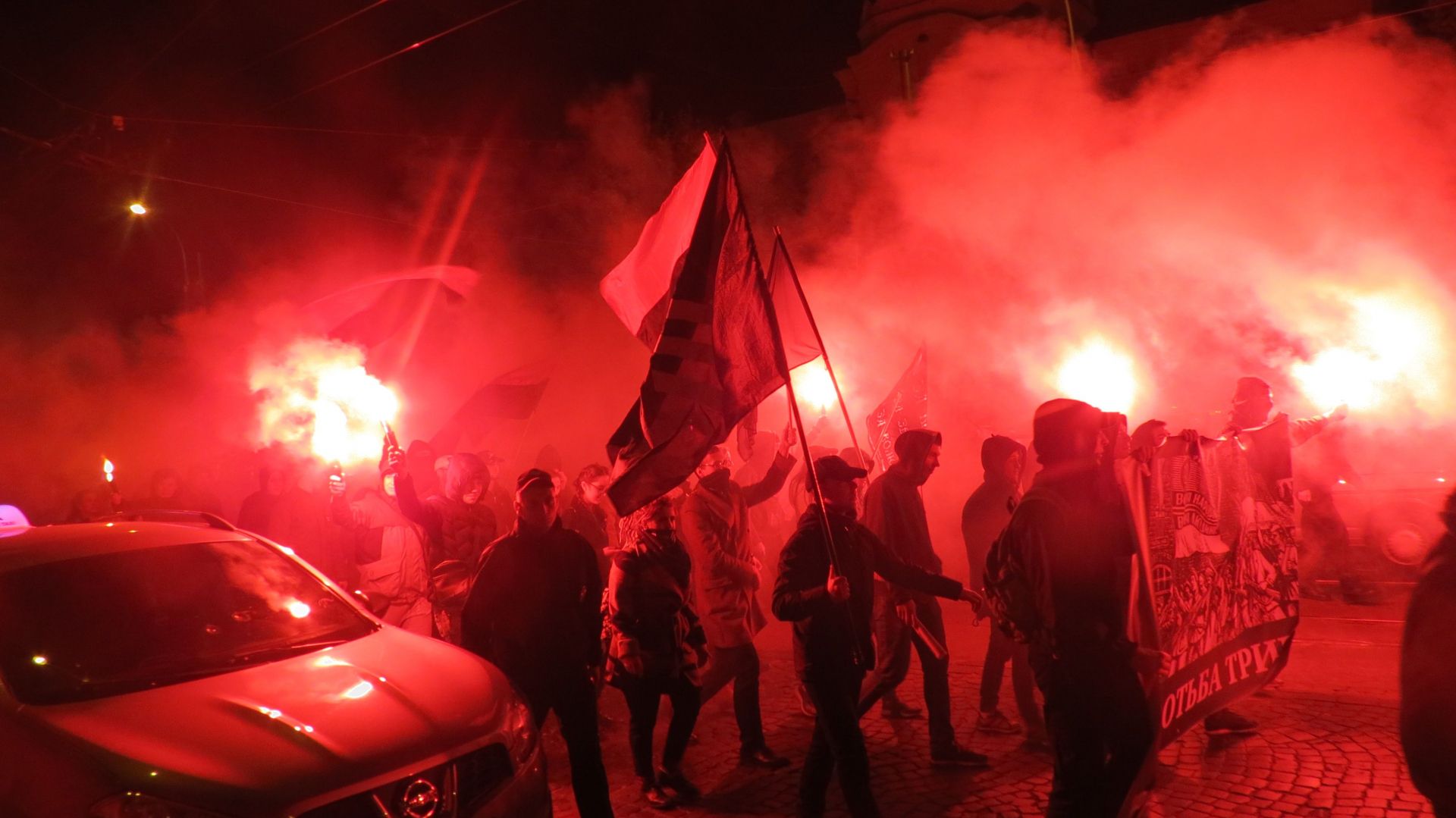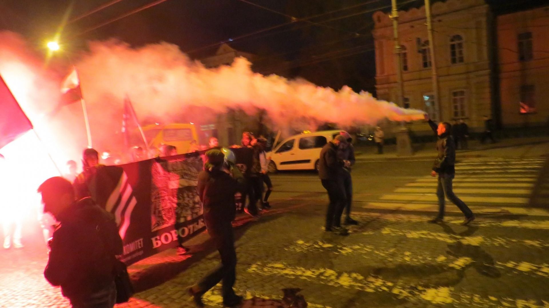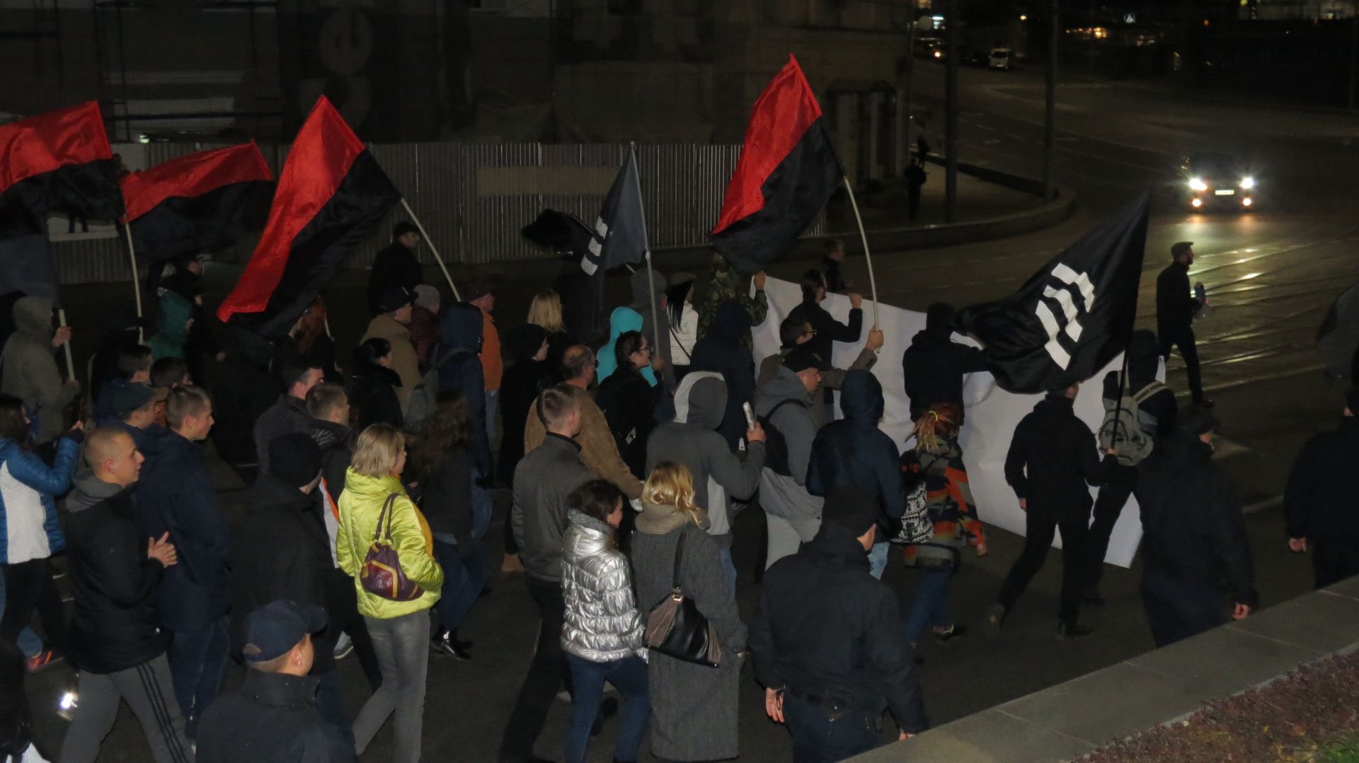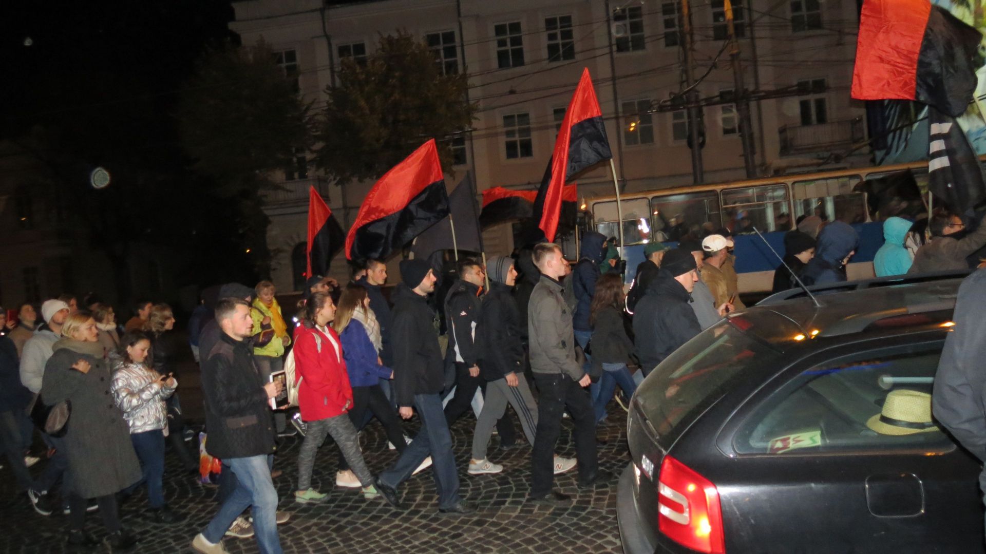 Вони зібралися на Європейській площі і пройшли колоною до пам’ятника Січовим стрільцям, що біля «Книжки». По дорозі запалювали фаєри і вигукували агресивні гасла. Серед них були: «Крим наш! Донбас наш! Кубань наша!», «Революція!», «Олігархи –– жирують! Герої – бідують!» тощо. Правоохоронці супроводжували молодих активістів, а деякі з них фотографували і записували їхні дії на відео.