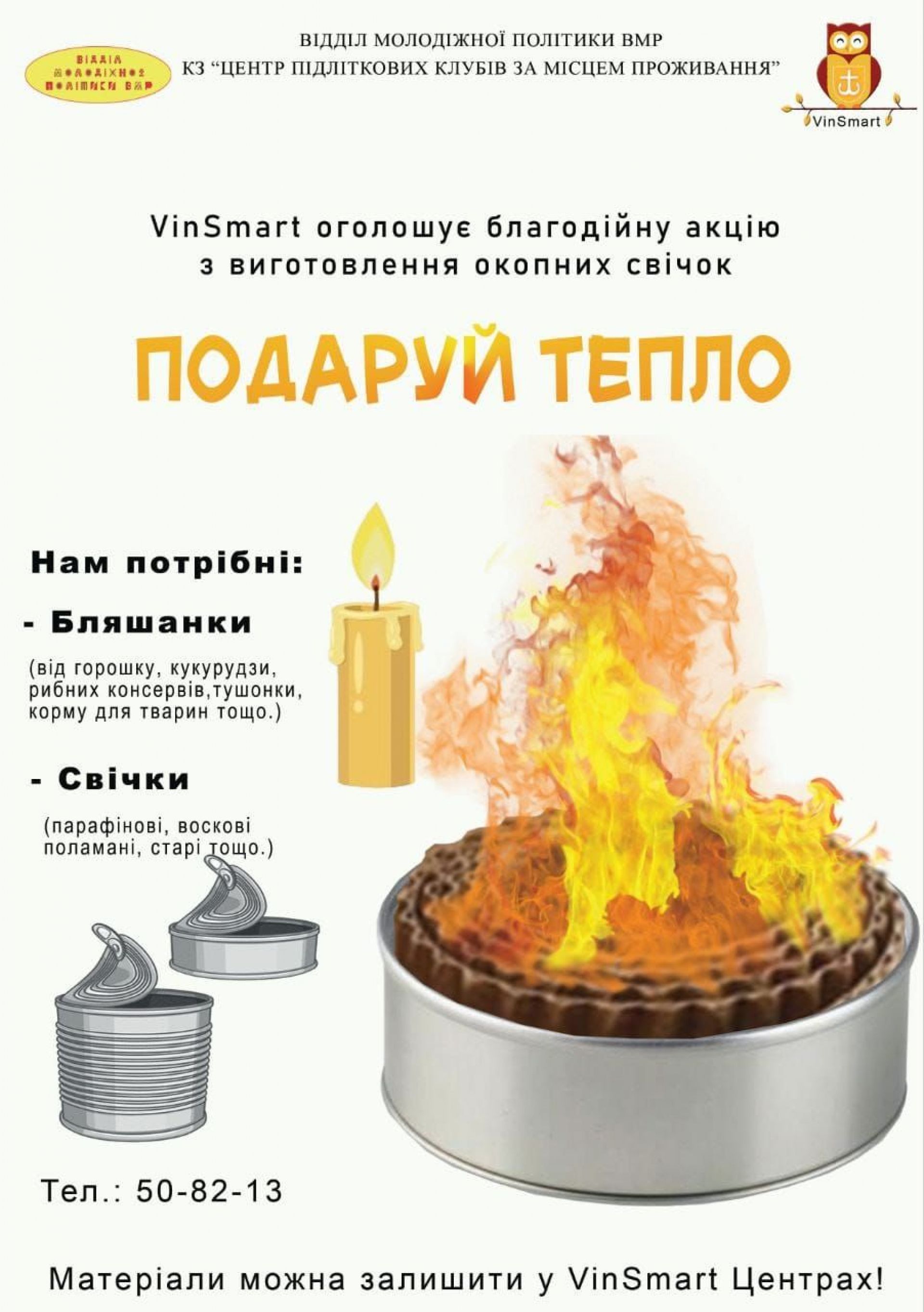 «Звичайна бляшанка перетворилася на джерело тепла, які дітки старанно наповнювали скрученим гофрокартоном, поки на плиті розтоплювався віск. Кожну свічку потрібно було тричі залити воском, щоб довше горіла. Така свічка приносить не тільки світло, а й тепло, до того ж не боїться вітру. За допомогою окопної свічки можна й зігрітися, і просушити одяг. Щасливі дітки, адже внесли свою частинку допомоги нашим захисникам», — каже одна з педагогинь VinSmart Центру Олена Бабійчук.