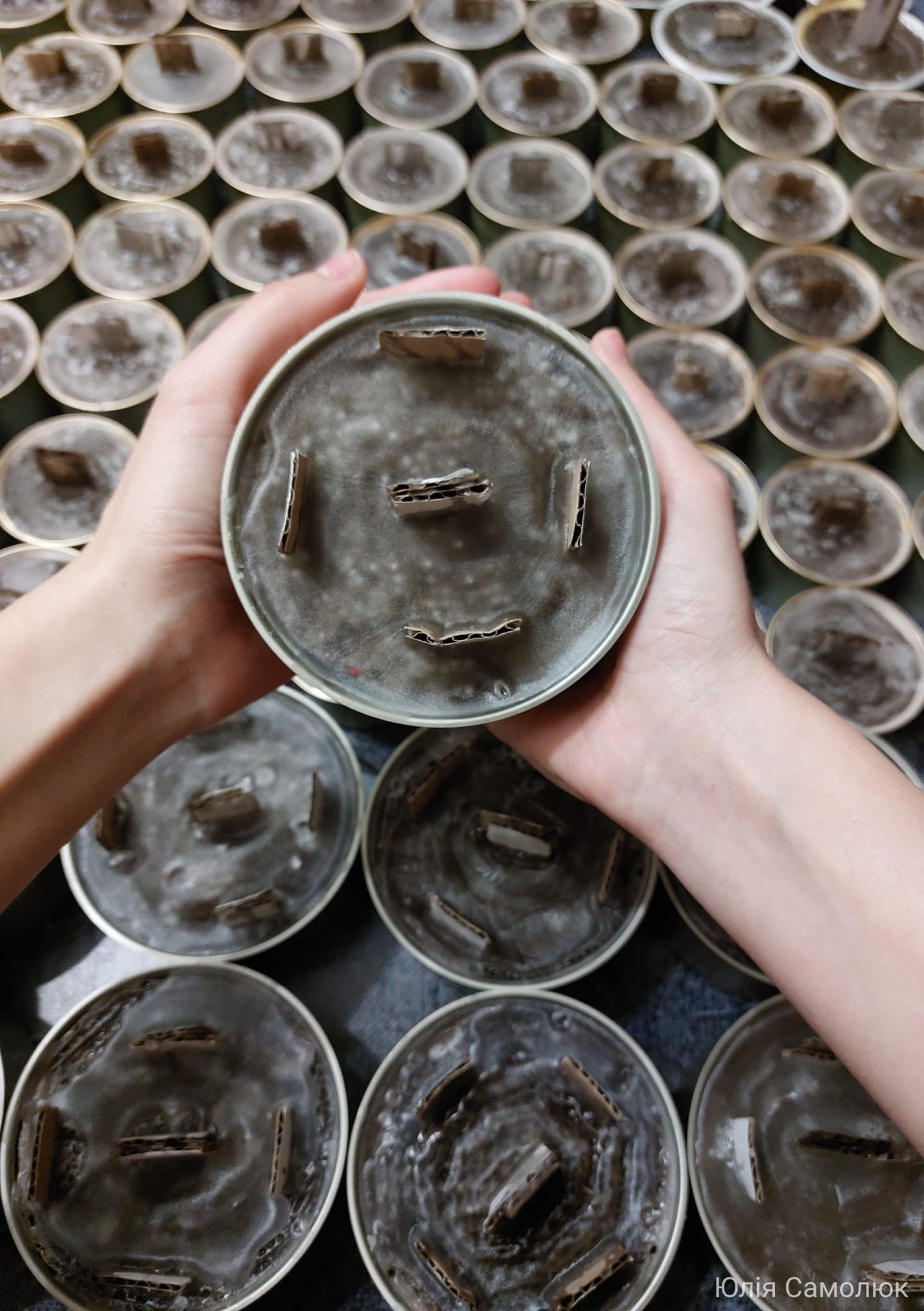 — Раніше я сушила сухофрукти на фронт, але їхній сезон закінчився, і я вирішила допомагати іншим чином. Дізналася, що такі свічки потрібні воїнам, і почала робити. Перший десяток зробила з воску, що знайшла в себе вдома, — пригадує волонтерка. — Далі я розказала сусідам, й вони почали зносити все, що мали: бляшанки, парафін, недопалені свічки. Є люди, які займаються бджолярством, то вони теж почали віск приносити. Загалом, сусіди підхопили цю ініціативу.