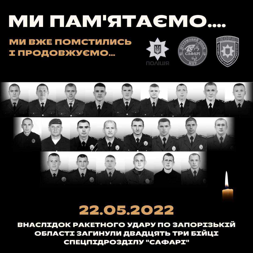 Нагадаємо, у ніч з 21 на 22 травня унаслідок масованого ракетного удару країни-терориста по позиціях захисників України в Запорізькій області, загинули 23 бійці полку Нацполіції. Серед загиблих — 19 бійців КОРД (Вінницька, Черкаська, Рівненська та Закарпатська області) і чотири представники поліції спецпризначення (Івано-Франківська, Чернівецька та Хмельницька області). З дванадцяти вінницьких спецпризначенців, які виконували службове завдання, живими залишилися троє.