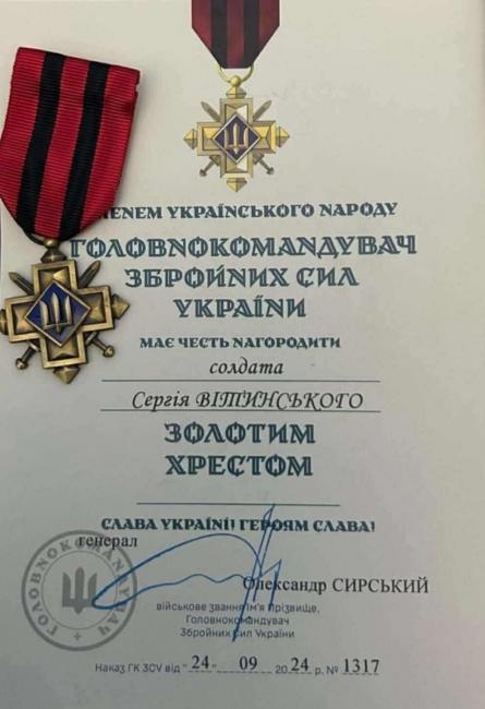 — Підрозділ, в якому служить наш земляк, перебуває у безпосередній близькості до передових ворожих позицій в одному з найзапекліших місць України. Наказ №1317 про відзначення "Золотим хрестом" Головком Олександр Сирський підписав 24 вересня 2024 року. Нагороду молодшому сержанту Сергію Вітинському вручив командир частини у червні 2025 року, — йдеться у повідомленні.