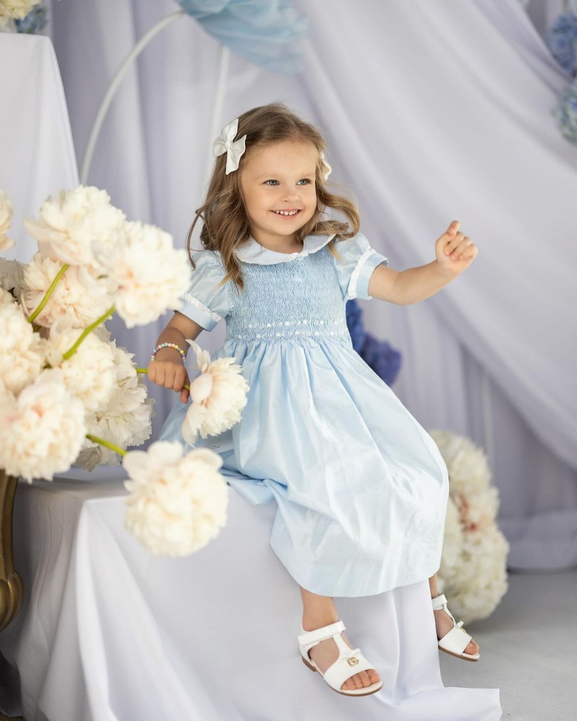 Донечку одягли спочатку в біленьку суконьку, а потім усі наділи лілові та блакитні кольори. Такий був дрескод.