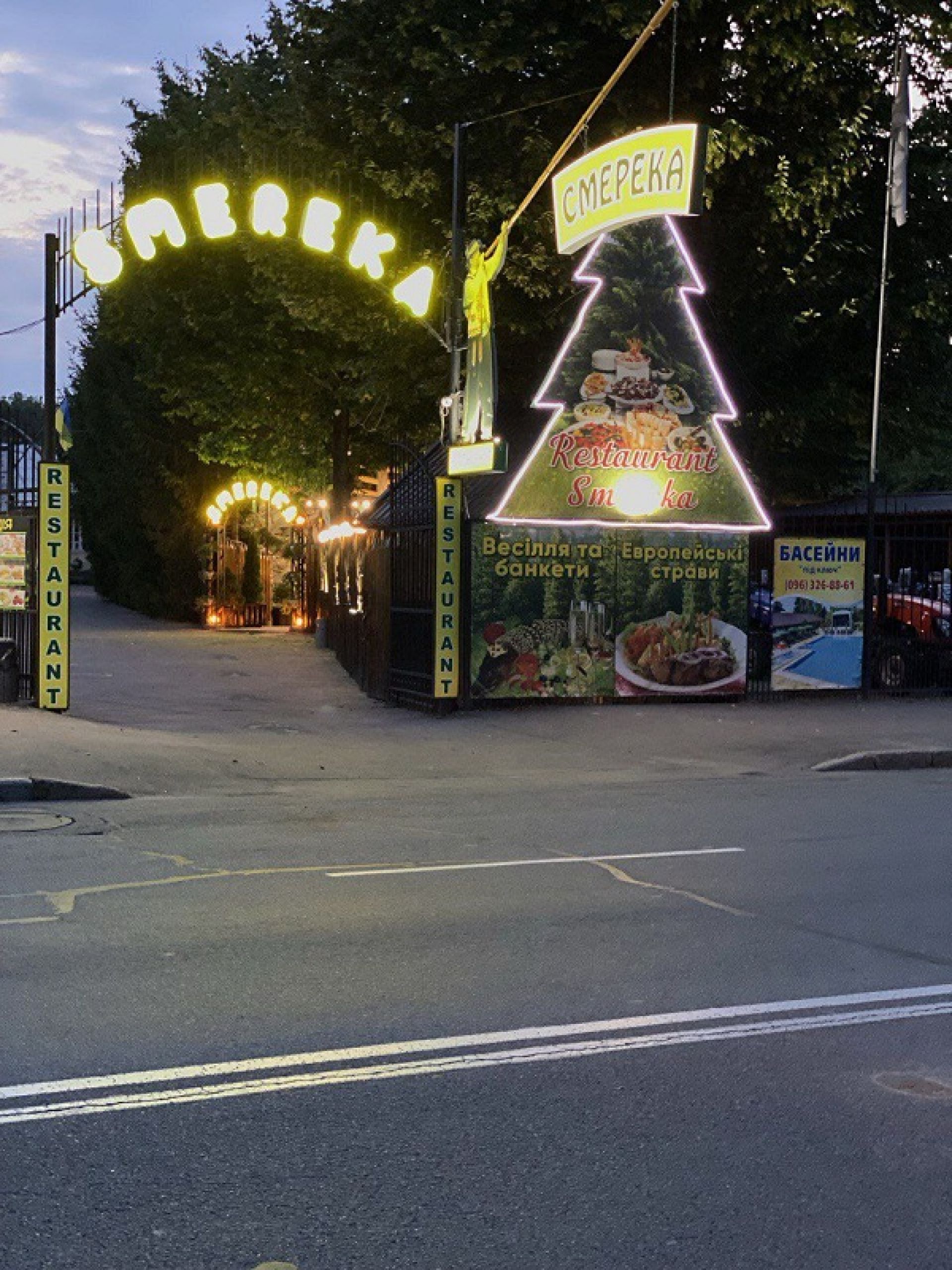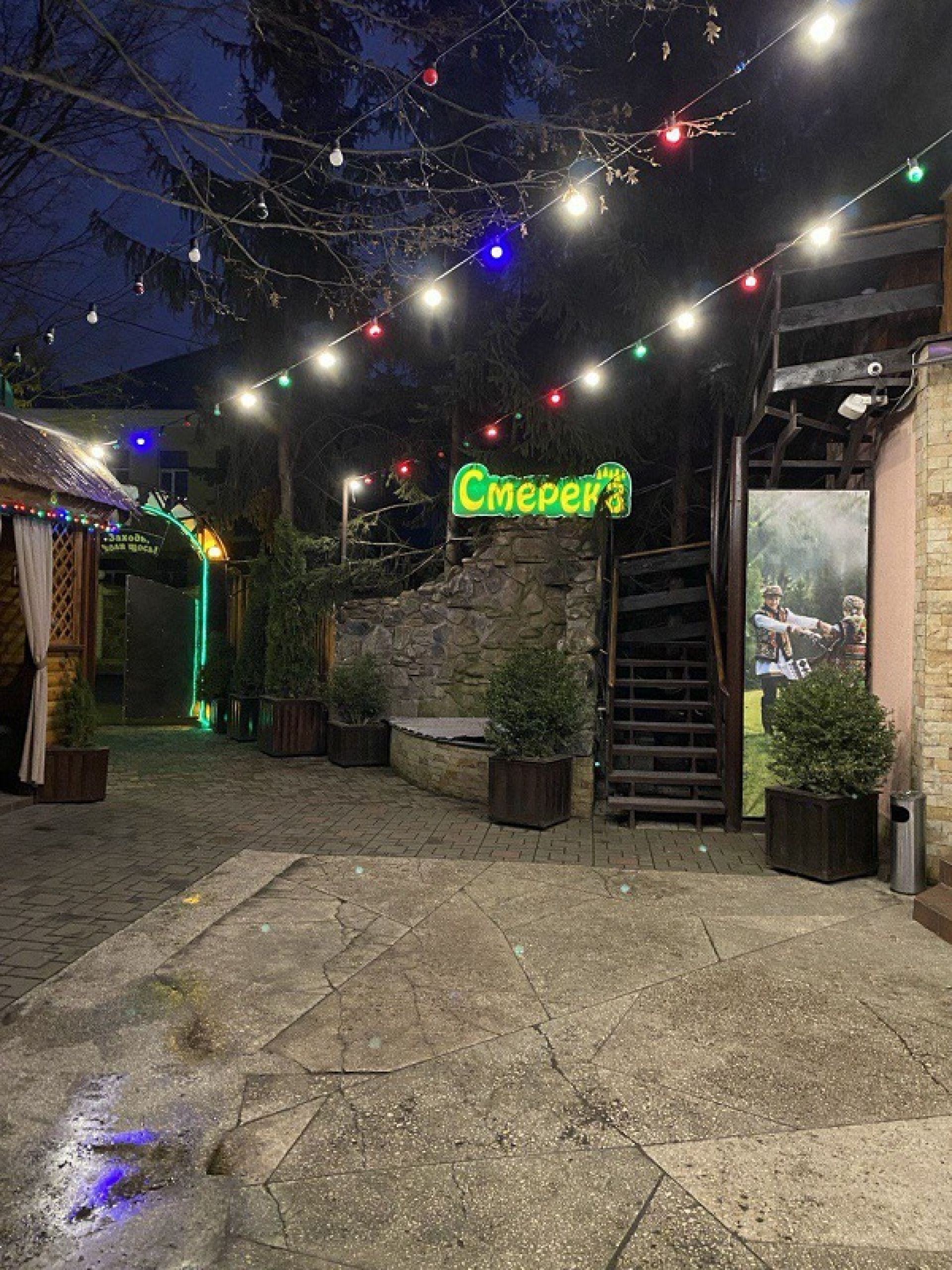 Маємо власну парковку, а навпроти вхід до ресторану, де є закрита зелена зона, велетенські смереки та багаторічні дерева, що створюють відчуття перебування в Карпатах.