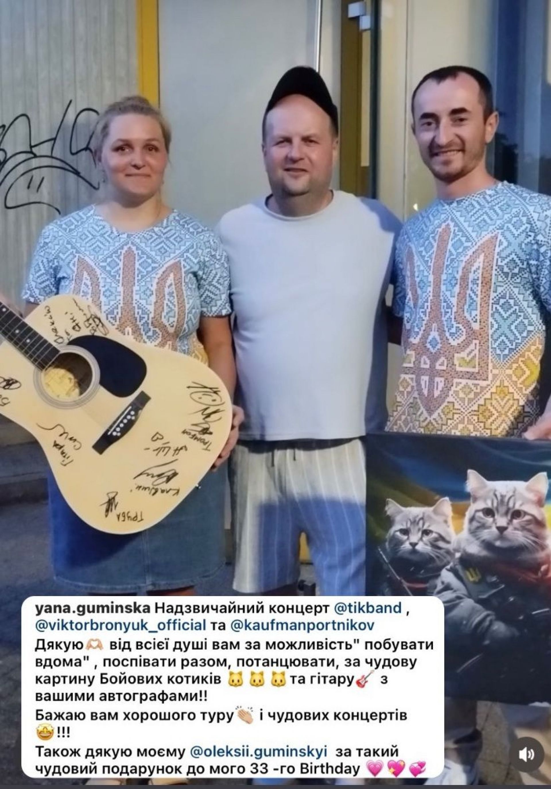 — Спеціально до нашого приїзду дітки з організації «Українці в Карлсруе» вивчили пісню «Люби ти Україну», яку ми залюбки разом заспівали на концерті, — розповідає Віктор Бронюк. — Це був дуже емоційний і щирий концерт, на якому були імпровізовані запальні хороводи, смачні частування за всіма українськими традиціями у перерві, і, звісно, благодійний аукціон та гучні овації подяки ЗСУ за понад 2000 км від Батьківщини. Після понад двогодинного концерту ми ще плюс годину опісля спілкувалися й фотографувалися зі всіма. Одна глядачка розповідала, що навіть із Казахстану спеціально на наш виступ приїхала. А найцінніше, що майже кожен ділився враженнями, що, прийшовши на концерт ТІК, «ніби вдома побував». Бо насправді, де би не були наші люди, ми є українцями, які понад усе люблять свою Батьківщину.