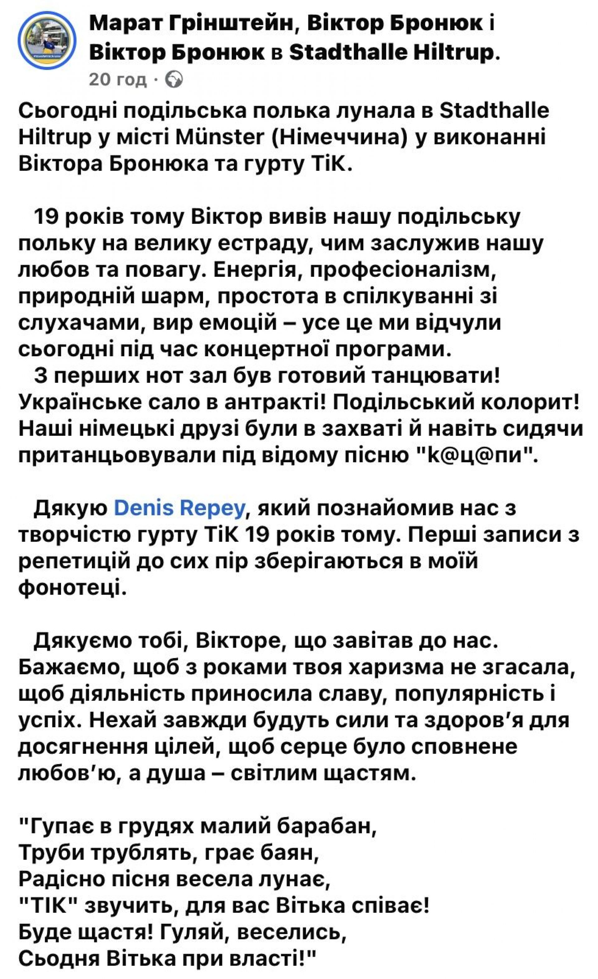 — Бачились з товаришем зі Жмеринки, а під час концерту пісню «Вчителька» заспівали разом із творчим колективом «Червона калина», який очолює Світлана Шурова — мама Дмитра Шурова Pianoбой, яка, до речі, свого часу була викладачкою зарубіжної літератури у коледжі у гітариста ТІК Сергія Апанасенка, — поділився Віктор Бронюк.