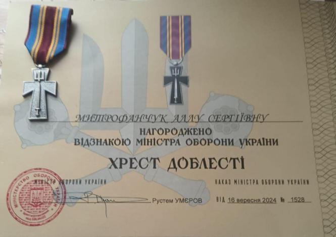 - Військову Аллу Митрофанчук удостоїли почесної нагороди — Хреста Доблесті від Міністра оборони України.