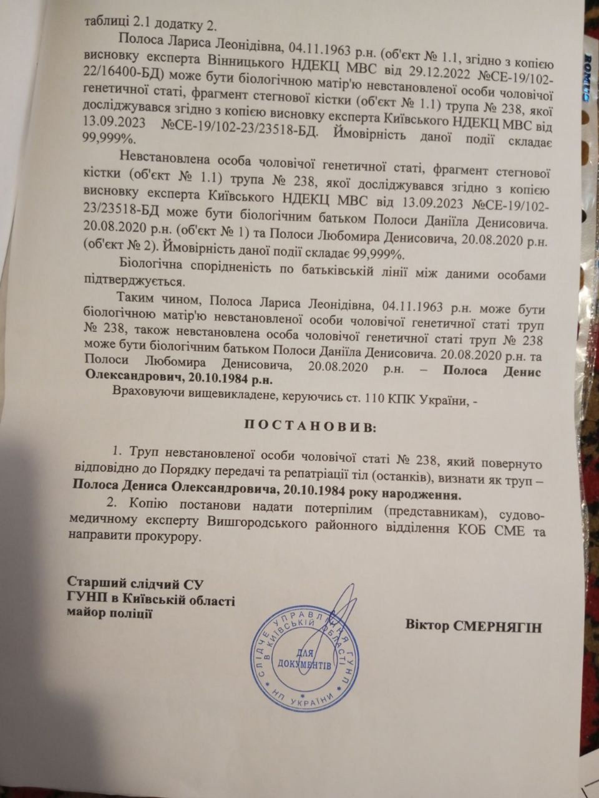 Такі дії обурюють жінку, оскільки, за її словами, саме вона їздила до Києва за тілом чоловіка. Перед тим проводили дві експертизи на основі ДНК синів Дениса та його матері Лариси Полоси. Обидві експертизи підтвердили спорідненість на 99,9%.