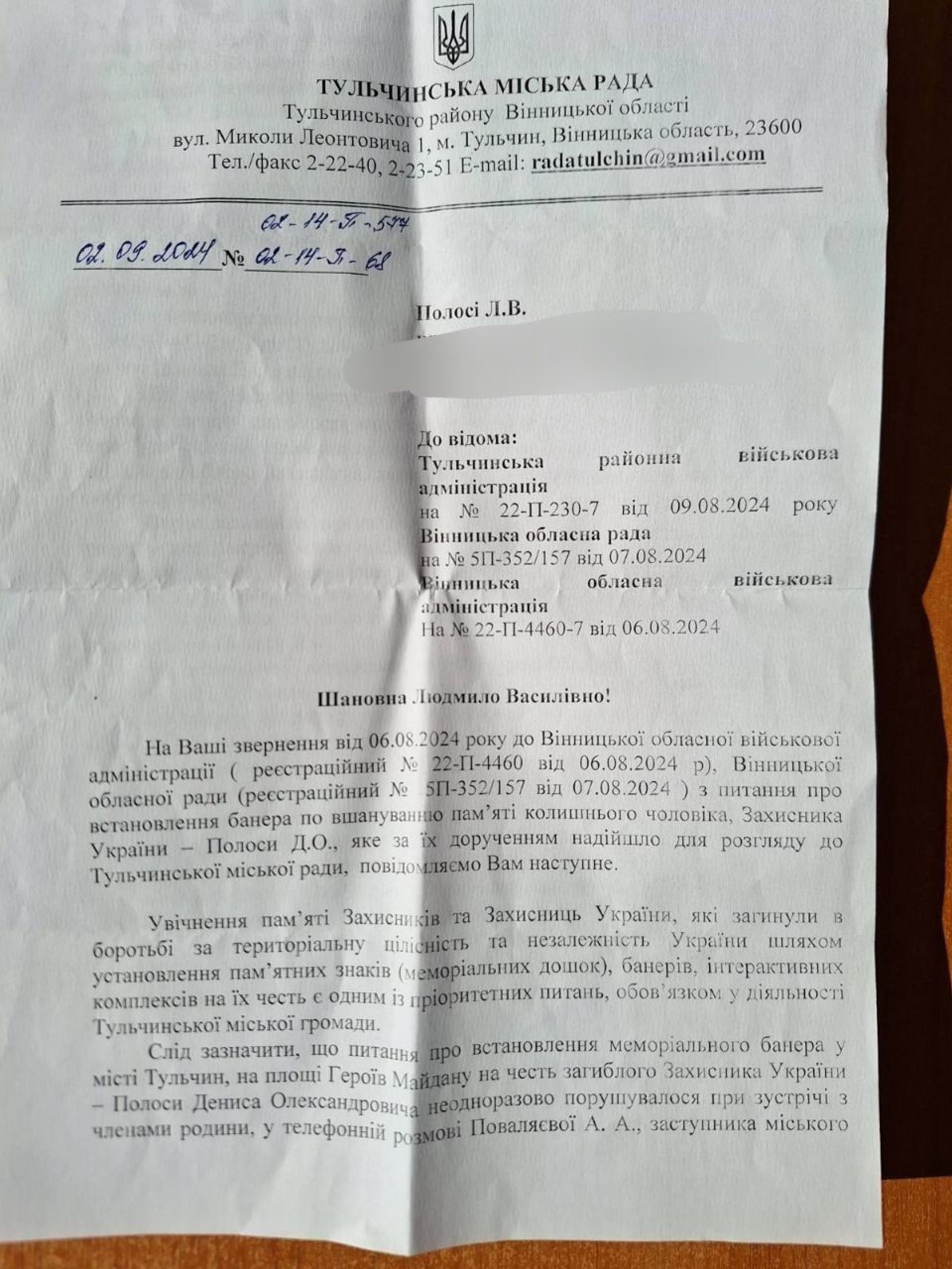 З відповідей, які надала Тульчинська міська рада, відомо, що вони не мають нічого проти встановлення банера в пам'ять про Дениса Полосу.