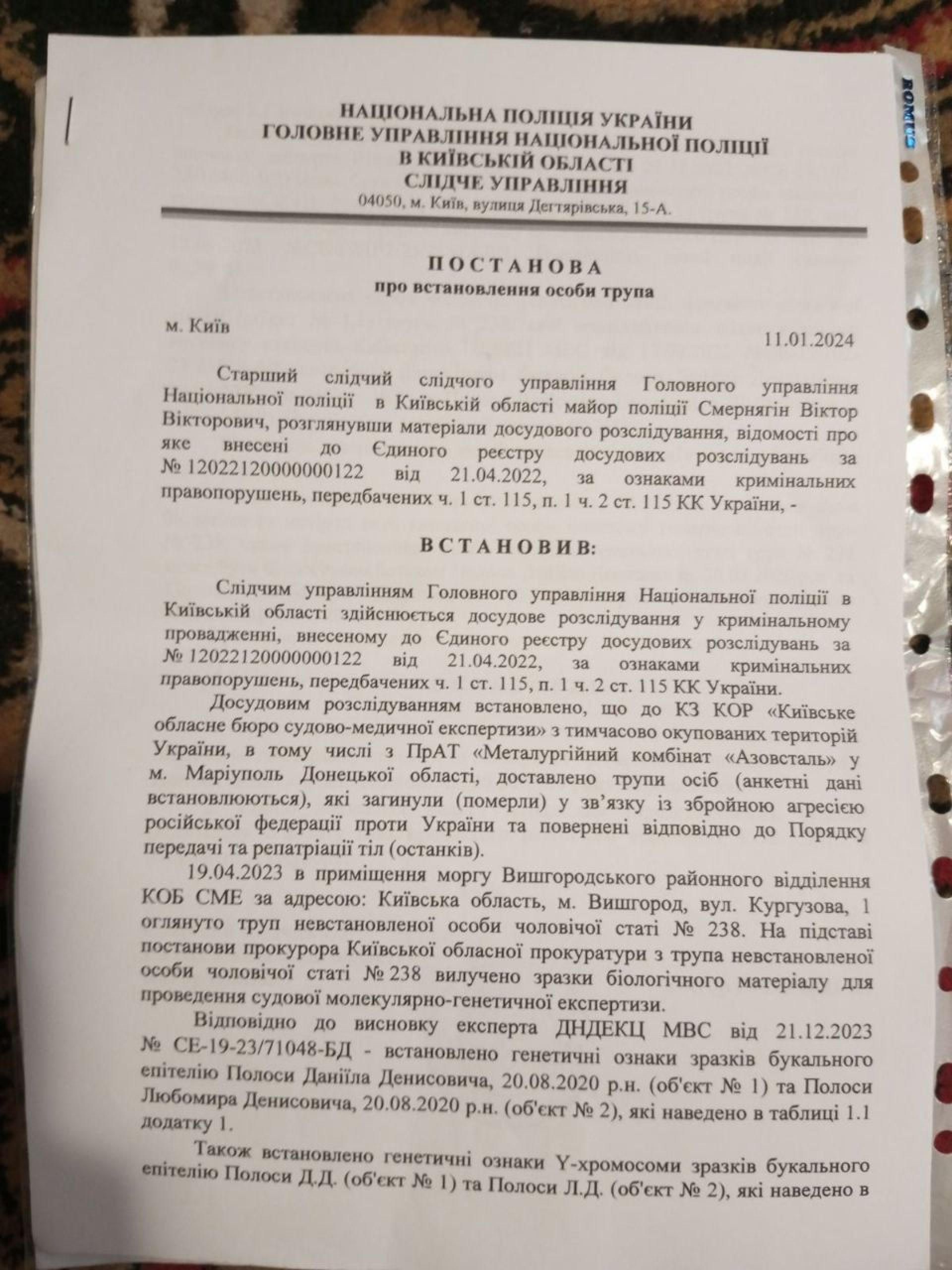 — Коли минуло сорок днів від експертизи, і можна було їхати забирати тіло, ніхто з них не поїхав, — говорить жінка. — Я спеціально отримала постанову, адже за документами ми були розлучені. Їхала й забирала тіло з Києва.