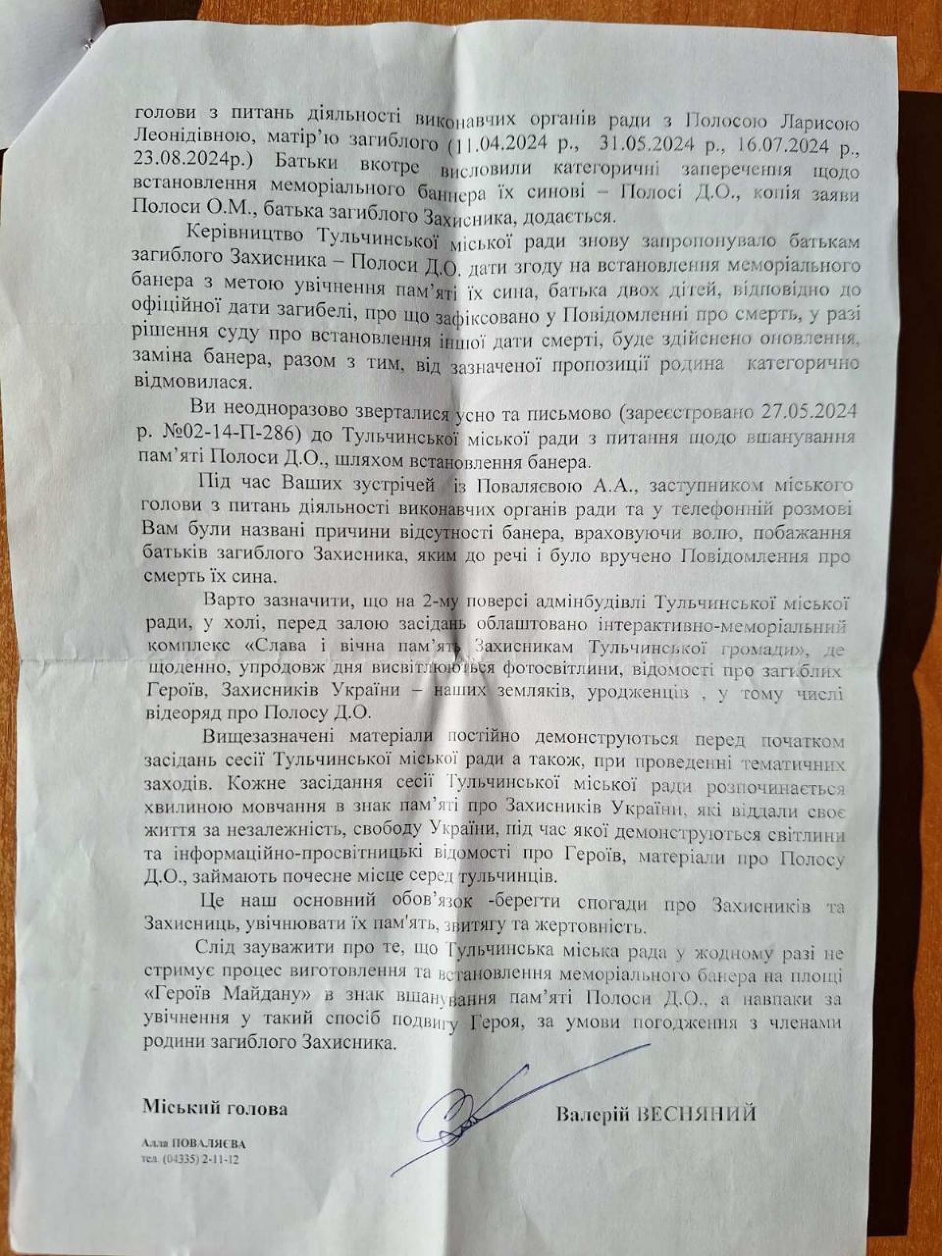 «Слід зауважити, що Тульчинська міська рада жодним чином не стримує процес виготовлення та встановлення меморіального банера на площі «Героїв Майдану» в знак вшанування пам'яті Полоси Д.О., а навпаки підтримує увічнення подвигу Героя таким чином за умови погодження з членами родини загиблого Захисника», — йшлося у відповіді.
