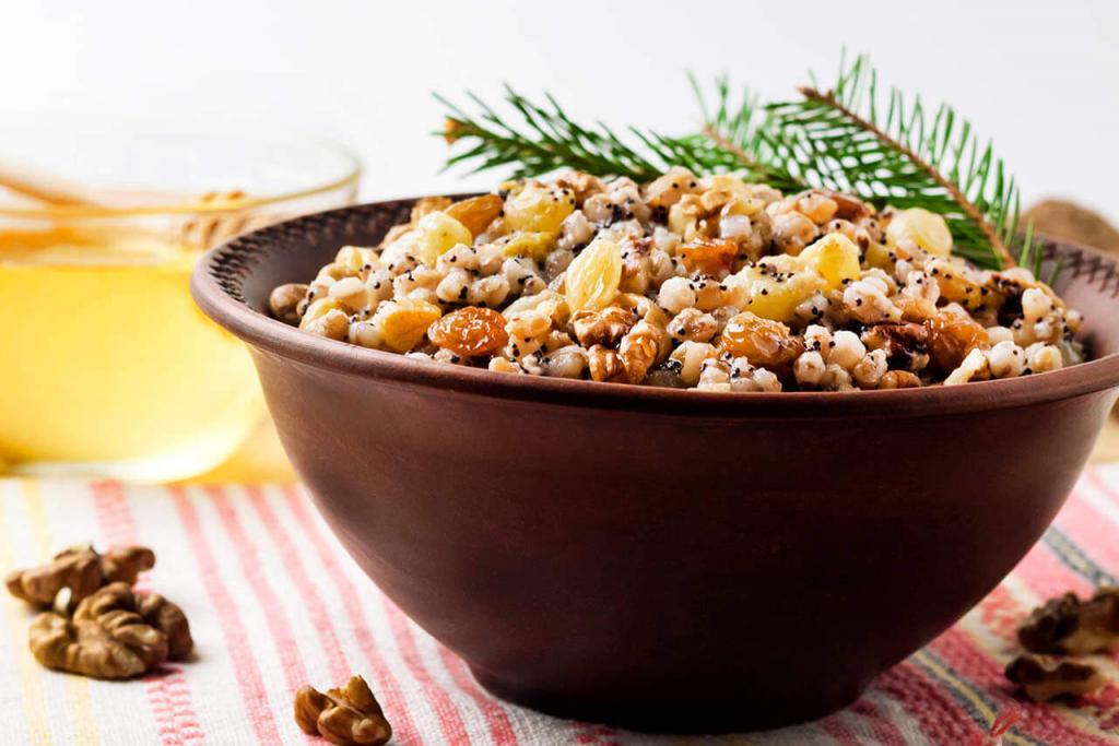 Беремо: 2 склянки пшениці, 100 гр маку, 100 грамів білих родзинок без кісточок, 100 грамів чорних родзинок без кісточок, 100 грамів не смаженого мигдалю, 100 грамів волоських горіхів, 100 грамів кедрових горіхів, 250 грамів меду, кип'ячена вода.