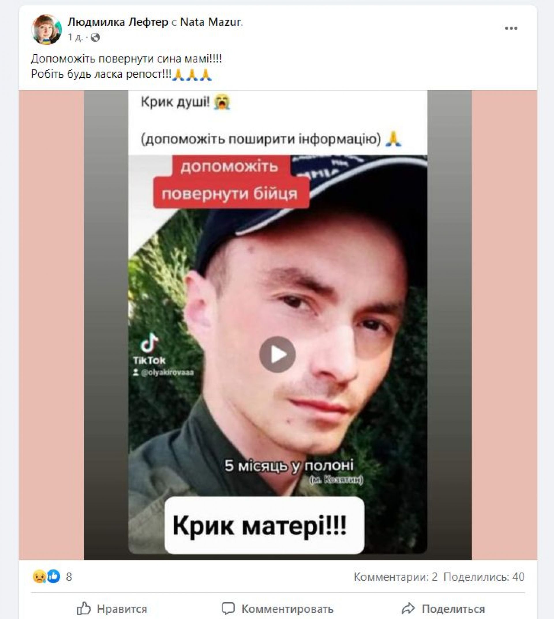 Мати благає про допомогу повернути бійця додому, адже материнське серце не на місці.
