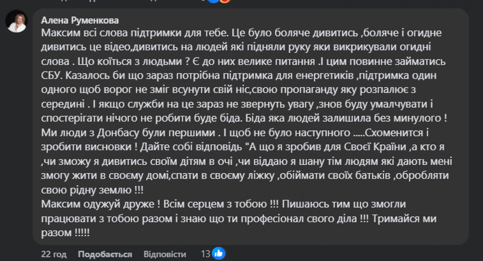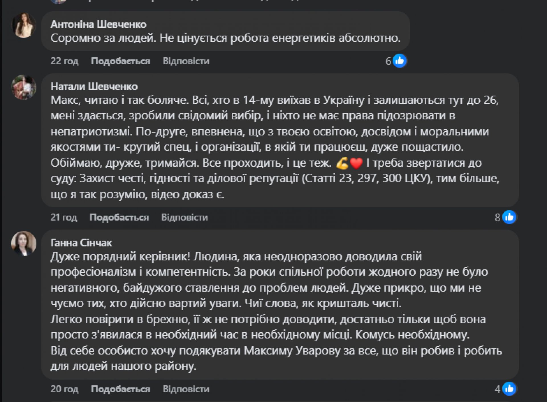 Допис Максима Уварова зібрав сотні коментарів. Більшість користувачів засудили напад та висловили солідарність із керівником РЕСу. Люди, які роками працюють із посадовцем, називають його професіоналом та справжнім патріотом.