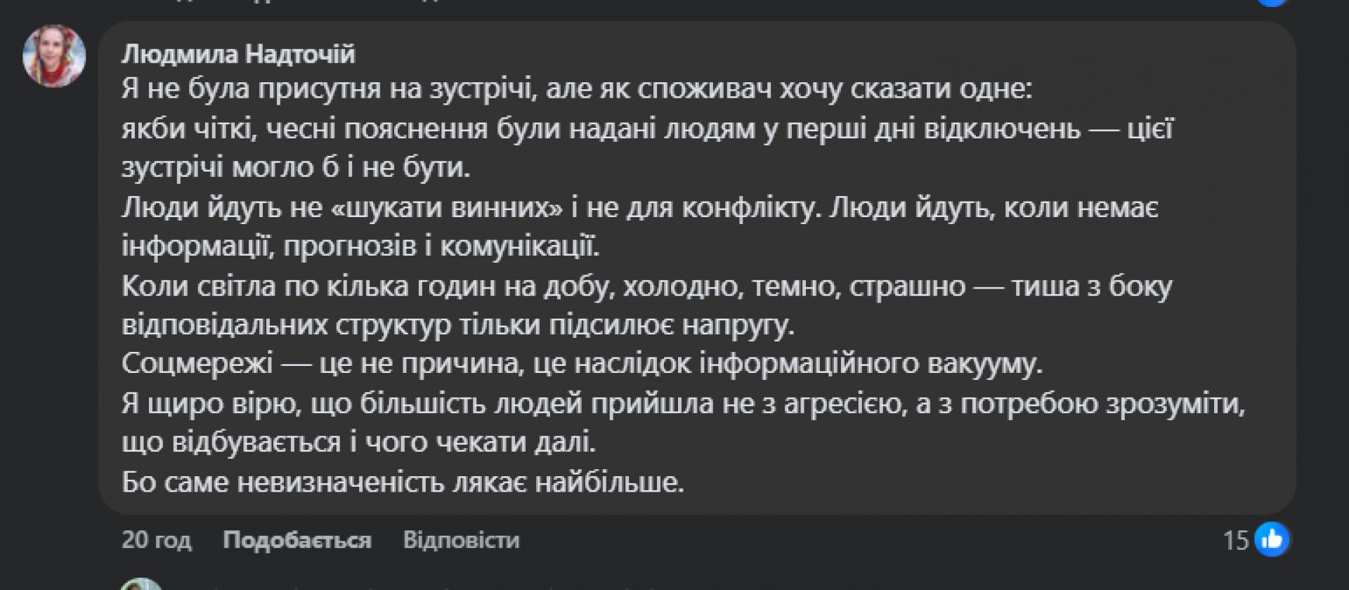 - Питання комунікації. Серед слів підтримки лунали й конструктивні зауваження. Людмила Надточій зазначила, що агресія часто є наслідком інформаційного вакууму: «Якби чіткі, чесні пояснення надали людям у перші дні відключень — цієї зустрічі могло б і не бути. Саме невизначеність лякає найбільше».