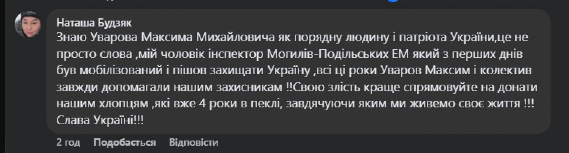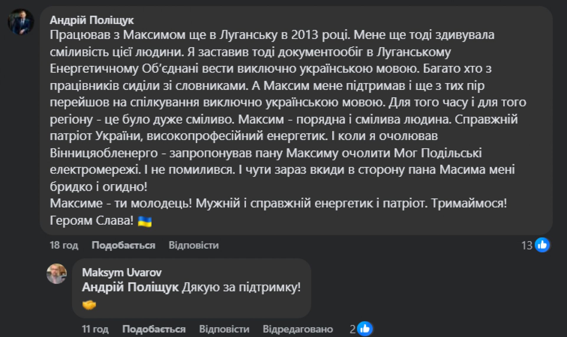 - Професіоналізм та волонтерство. Колеги та знайомі нагадали, що Максим Уваров не лише тримає енергетичний фронт, а й активно допомагає ЗСУ. «Знаю Вас як розумного, принципового та справедливого спеціаліста. Дякуємо за роботу!» — пише Микола Стафійчук. Наталя Будзяк додала, що керівник та колектив РЕСу постійно підтримують її чоловіка, який воює на передовій.
