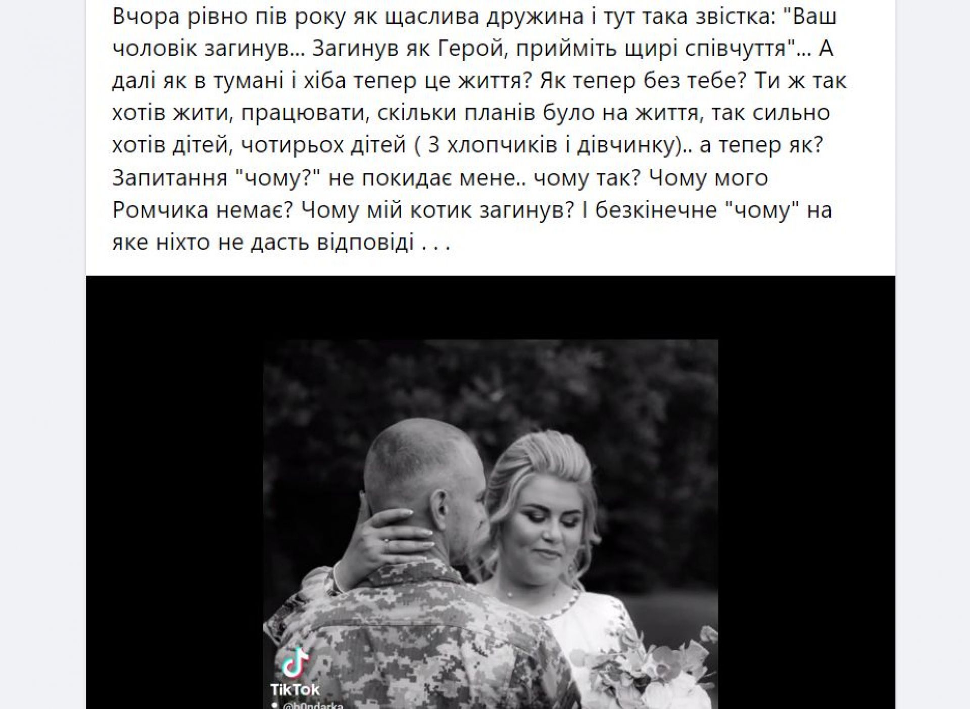 Вчора рівно пів року як щаслива дружина і тут така звістка: "Ваш чоловік загинув... Загинув як Герой, прийміть щирі співчуття"... А далі як в тумані і хіба тепер це життя? Як тепер без тебе? Ти ж так хотів жити, працювати, скільки планів було на життя, так сильно хотів дітей, чотирьох дітей ( 3 хлопчиків і дівчинку).. а тепер як?