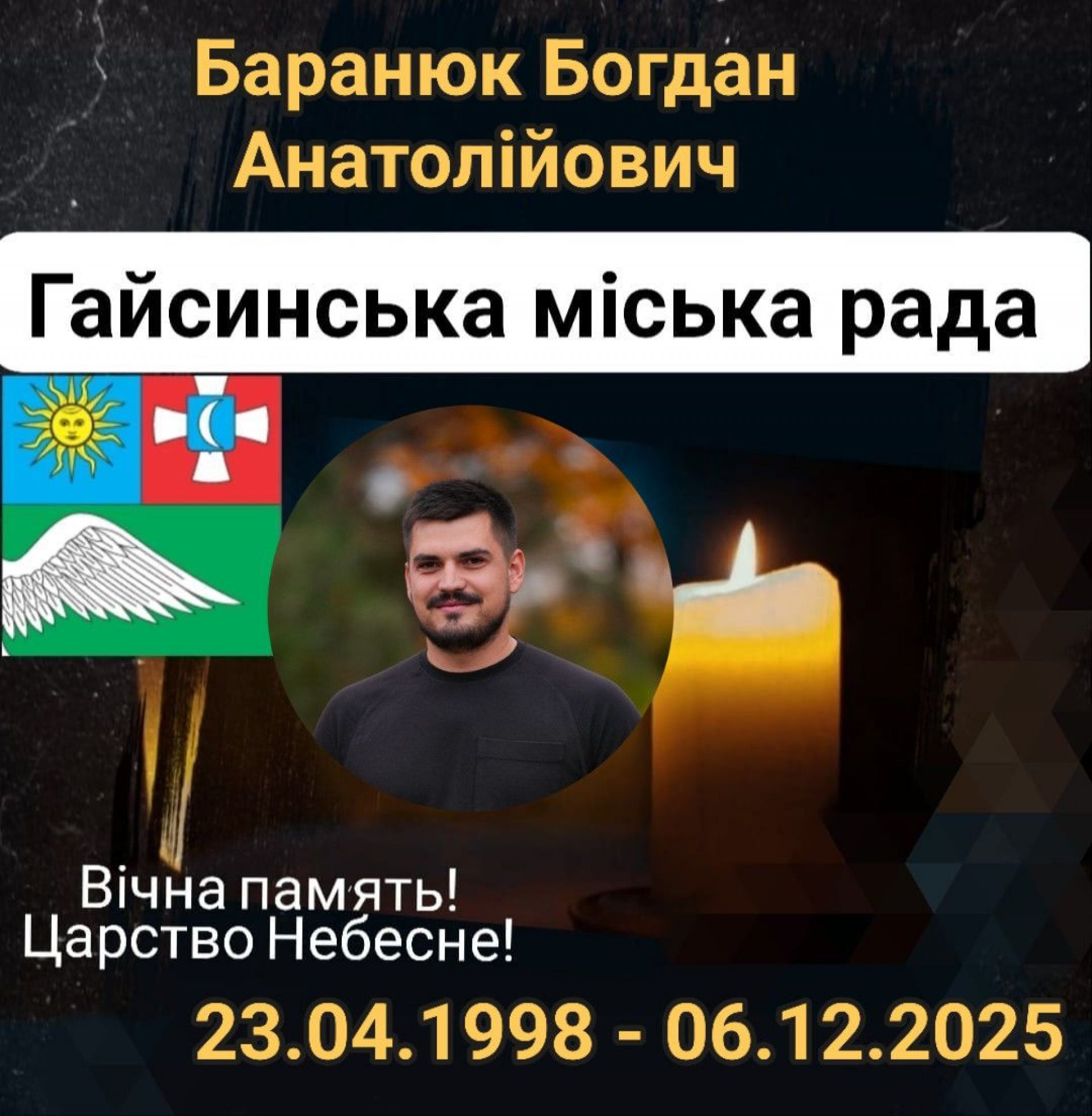 Гайсинська міська громада повідомила про важку втрату. Додому «На щиті» повертається 27-річний захисник, старший солдат Богдан Баранюк, житель села Кущинці.