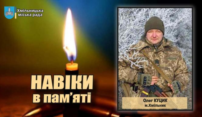 — Знову в небі над Хмільницькою громадою тужливим плином закружляли журавлі. Ще один наш мужній земляк-воїн полине з ними навіки до лав небесного війська, — читаємо у повідомленні. — Зі скорботою в серці сповіщаємо, що 17 березня 2024 року в м. Костянтинівка Донецької області помер, вірний військовій присязі, за нашу Батьківщину, Куцик Олег Федорович, 1983 р.н., хмільничанин, військовослужбовець Збройних Сил України.